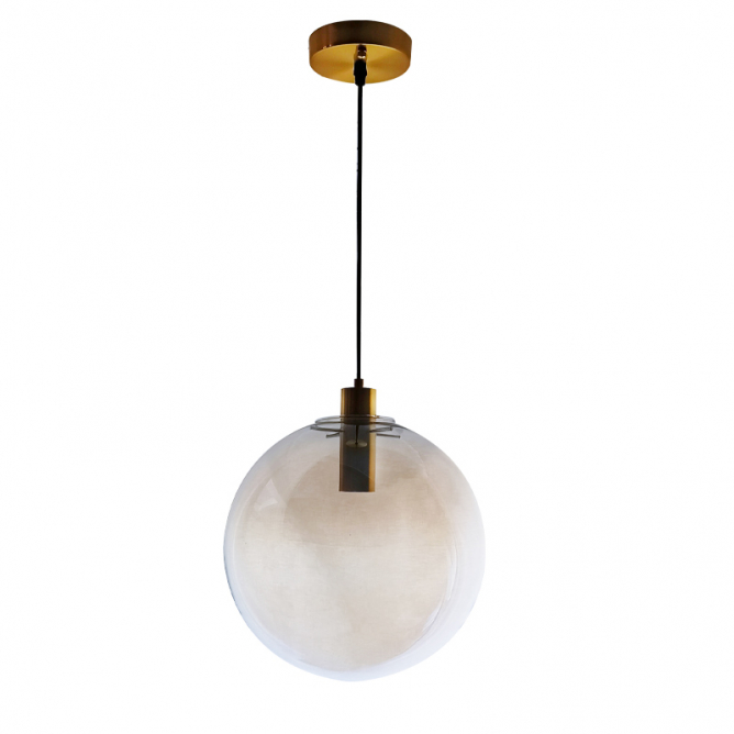 Elegantna i jednostavna visilica sa staklenom kuglom u boji konjaka i sa jednim sijaličnim grlom tip E27. Najbolji efekat se postiže upotrebom dekorativnih sijalica tipa Filament ili Edison. Plafonska rozetna i nosač staklene kugle su u boji zlata. Kugla ima prečnik 30cm.