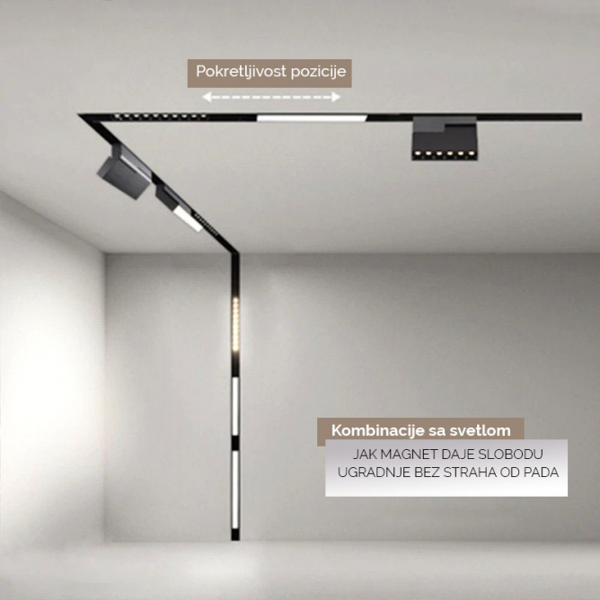 Magnetic ugradna šinska rasveta iz nove serije MAGNETIC predstavlja NOVI sistem magnetnog povezivanja sa šinom. Rasvetna tela se postave na željeno mesto, pritisnu na šinu i već su spremna za rad. Magnetni sistem šinske rasvete je idealan za sve prostore, a pogotovo za one koji zahtevaju čestu promenu količine i poziciju svetlosti, što Vam MAGNETIC sistem dozvoljava da svaka ta promena bude savršeno odrađena sa samo par klikova i bez upotrebe dodatnog alata. Savršeno rešenje koje je odlično i za projektnu rasvetu, a isto tako i u privatnim rezidencijama.