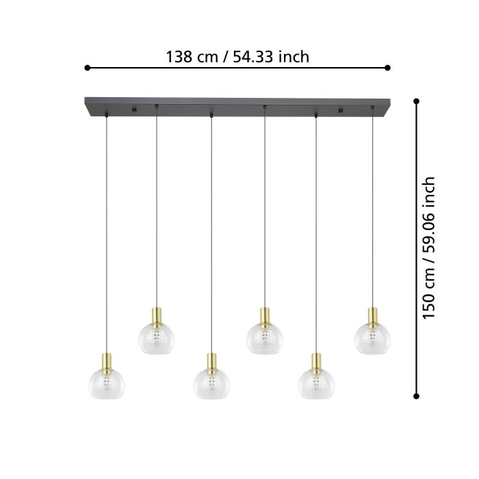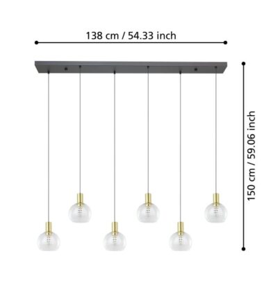 TERKUE LED visilica je napravljena od crne, izdužene nadstrešnice sa šest visećih prozirnih kuglica. Lopte se sastoje od elegantne kombinacije dve čaše. Čitav element je lepo osvetljen unutrašnjim sjajnim staklom, dok spoljašnje staklo daje dizajnu jednostavnu eleganciju. Mesingani nastavak deluje kao kontrast i daje delikatnim elementima osvetljenja ekstravagantan izgled. Integrisane LED diode pružaju prijatno toplo belo svetlo i mogu se prigušiti pomoću odgovarajućeg rotacionog dimera na zidu. Svojom širinom od 138 cm, privesna lampa dodaje dodatni šarm i nudi atmosfersko osvetljenje za svaku prostoriju – bilo u dnevnoj sobi ili u trpezariji iznad trpezarijskog stola.