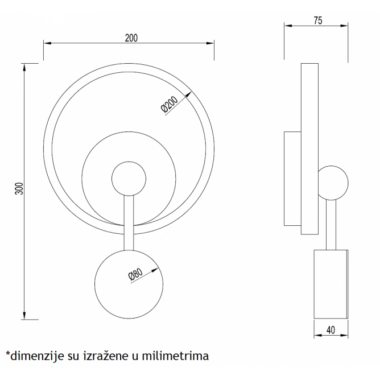 LED zidna lampa sa okruglim svetlećim delom, u boji mesinga/brušenog zlata, izrađena od aluminijuma i metala sa pvc difuzorom. Lampa je snage 15w, emituje toplo belu svetlost. Pogodna je za stanove, poslovne prostore, ugostiteljske objekte. Lampa emituje svetlost iz prstena, sa unutrašnje strane i iz donjeg okruglog dela.