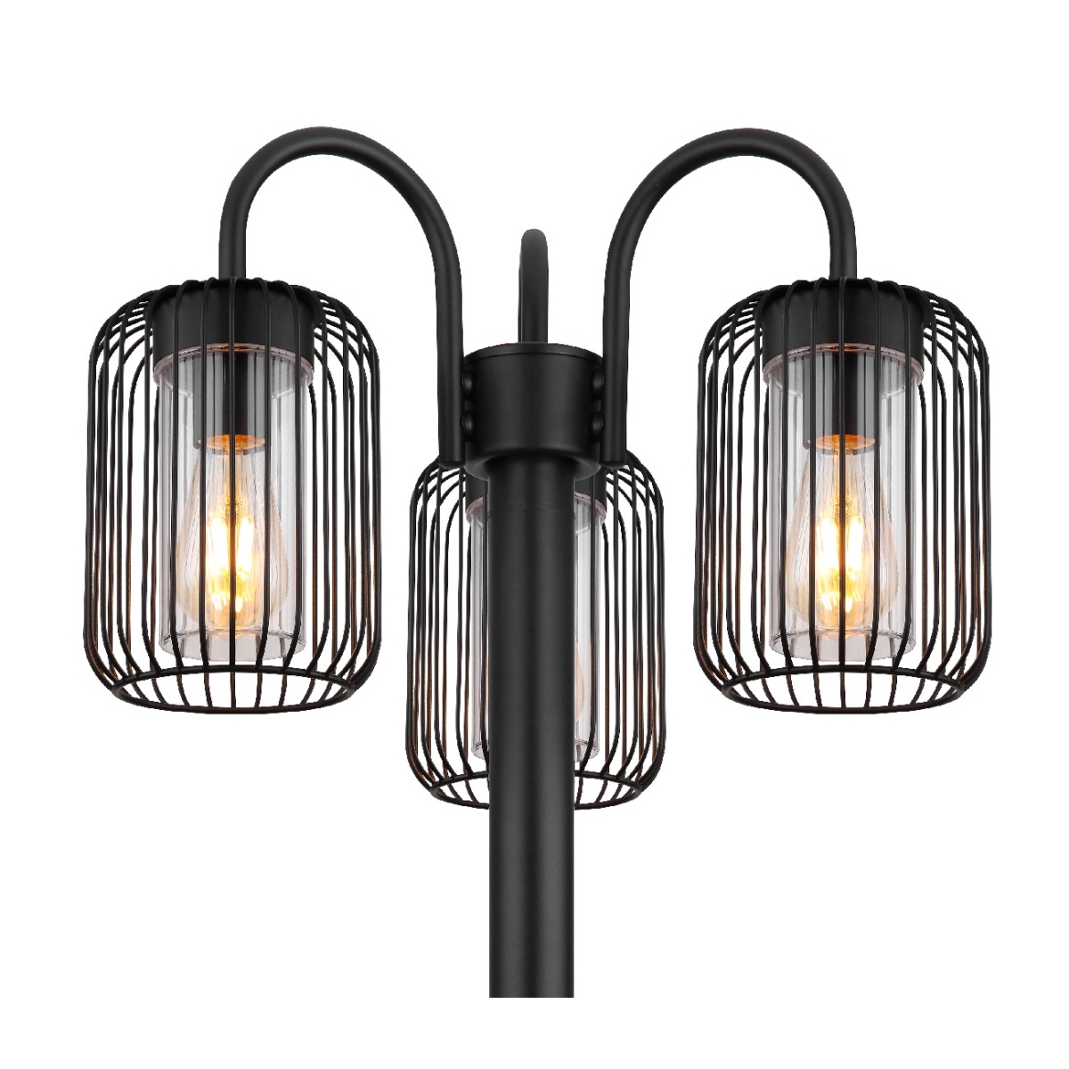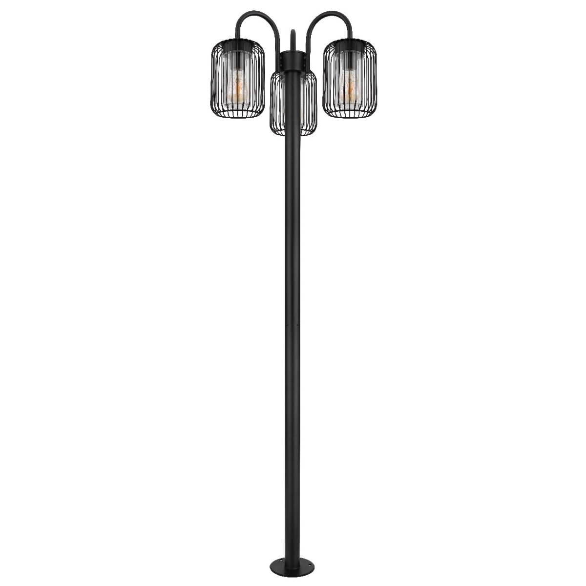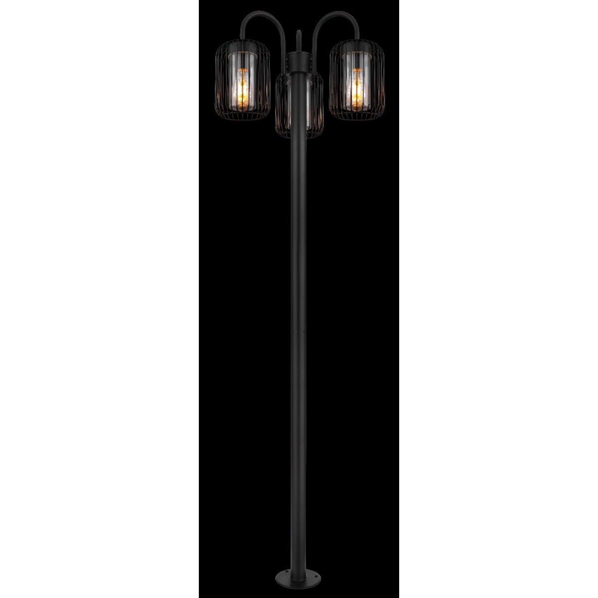 Ova plemenita spoljašnja lampa impresionira svojim kontinuiranim crnim mat dizajnom napravljenim od nerđajućeg čelika. Iz okrugle osnove viri 1.8m visoko cilindrično kućište, na kome su montirane tri zakrivljene metalne šipke, svaka se završava na E27 grlu sa oblikovanim abažurima napravljenim od metalnih šipki (Ø16 cm). E27 grla vam omogućavaju da sami odredite boju svetla i jačinu do maksimalnog izlaza od 15 vati. Zbog dugovečnosti i uštede energije preporučujemo LED sijalice.