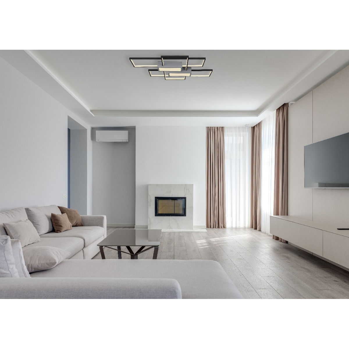 Ova moderna plafonska lampa impresionira prelepim dizajnom i funkcijama. Pet pravougaonika sa integrisanim LED panelima u različitim veličinama čine dizajn lampe. Oni sijaju od 2700 Kelvina toplo bela do 6000 hladno bela svetlost i mogu se fiksirati i zatamniti između ovih vrednosti. Pomoću uključenog daljinskog upravljača možete da koristite režim noćnog svetla za dobar noćni san ili funkciju memorije da biste sačuvali poslednju korišćenu postavku.
