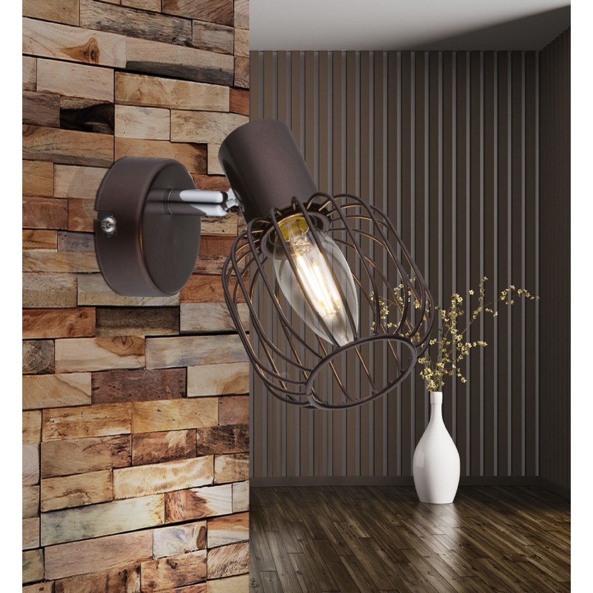 Nesvakidašnja kombinacija rđe, smeđeg i hromiranog metala u obliku mreže posebna je karakteristika ove tradicionalne zidne lampe iz serije AKIN. Sijalicu za E14 grlo možete odabrati vi (max. 40W). Zbog uštede energije i trajnosti preporučujemo LED sijalice. Uz ostale lampe iste serije, sliku možete upotpuniti u svom dnevnim boravku.