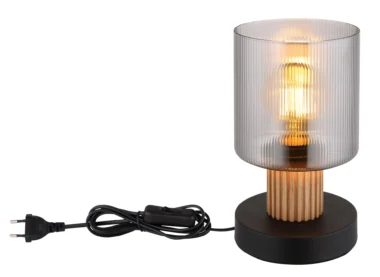 Stona lampa ALEIDIS impresionira svojim dizajnom u obliku šolje i drvenim aplikacijama. Abažur od dimljenog stakla i crno, mat metalno kućište čine harmoničnu kombinaciju zajedno sa tamnosmeđim drvetom. Prekidač na kablu omogućava jednostavno rukovanje. Pogodno za sijalicu E27 (ekskluzivno).