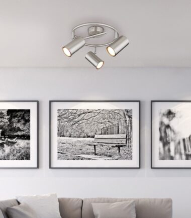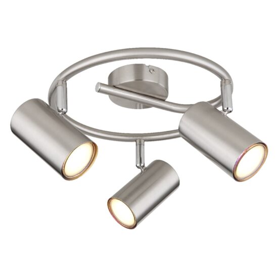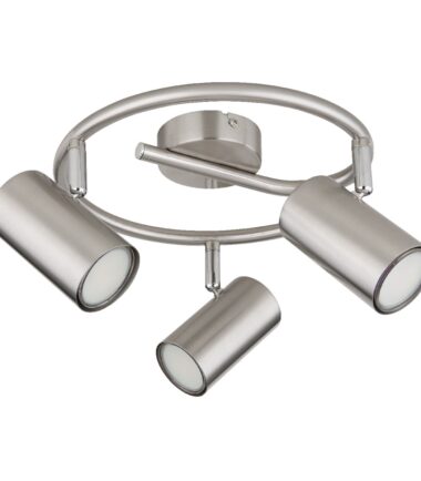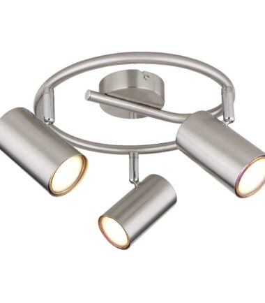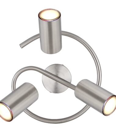 Ovaj jednostavan reflektor inspiriše sjajnim dizajnom. Zakrivljena metalna šipka prečnika 25 cm ide od hromiranog okruglog plafonskog nosača. Postoje tri rotirajuća zgloba, svaki sa GU10 grlom. To vam daje maksimalnu snagu od 25 vati da sami odredite boju svetla i jačinu. Zbog dugovečnosti i uštede energije preporučujemo LED sijalice.