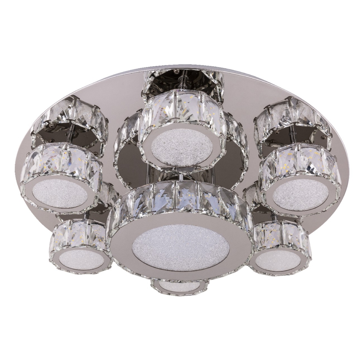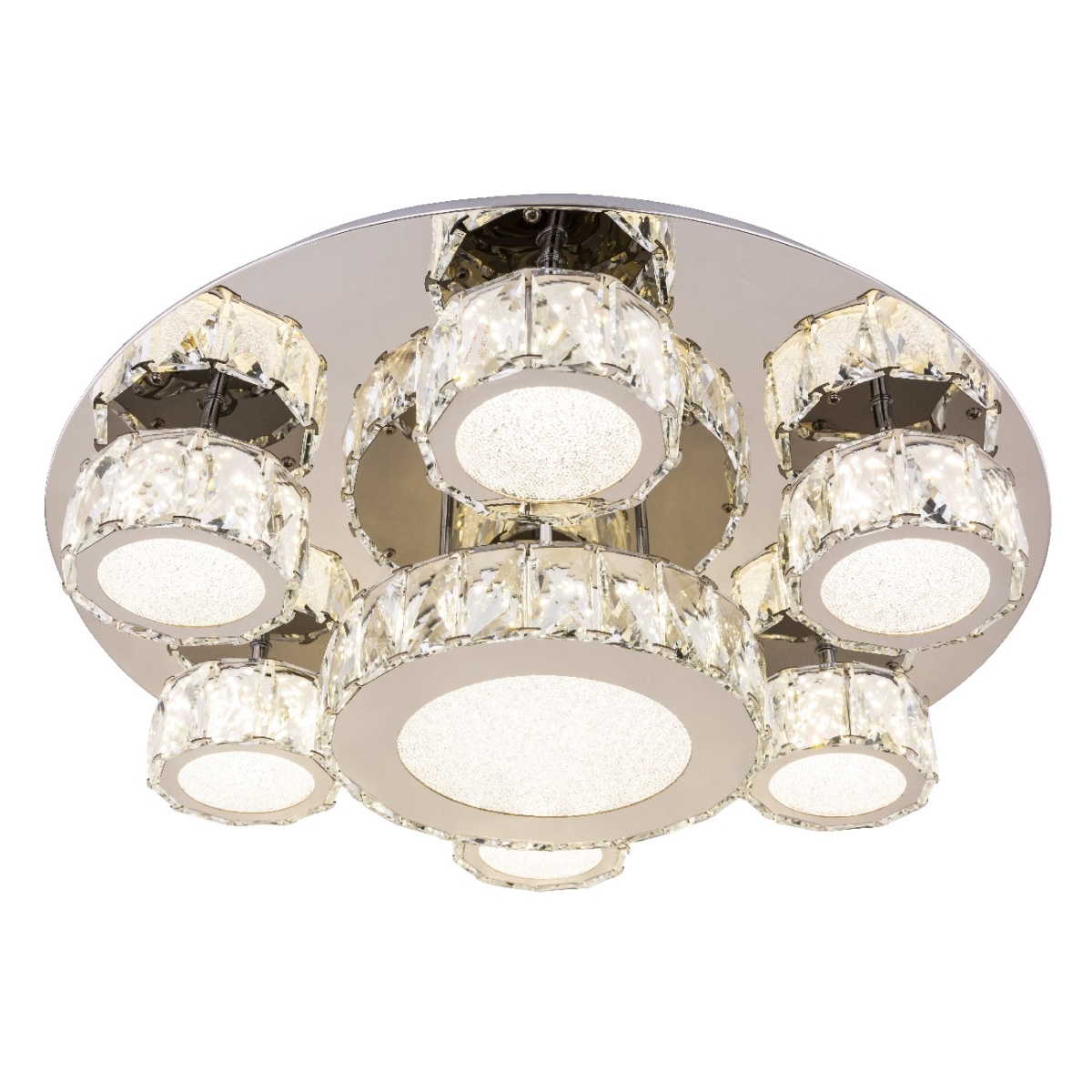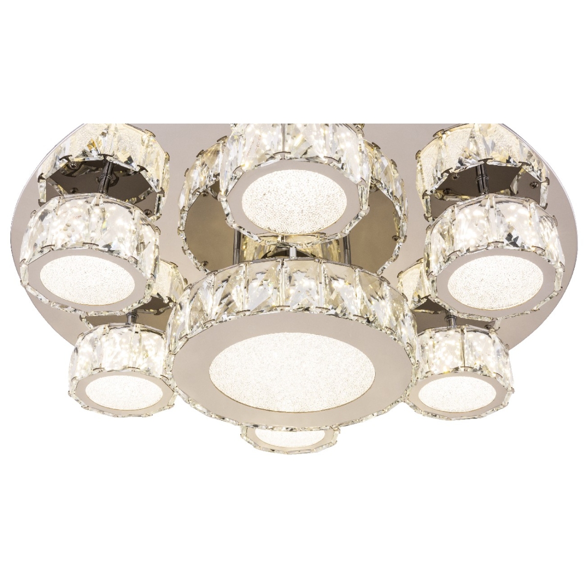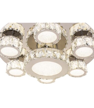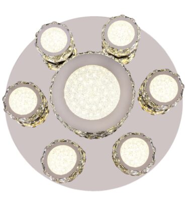 Ova okrugla plafonska lampa AMUR (Ø 55 cm) impresionira svojim izgledom. Sedam reflektora pričvršćenih za hromiranu površinu okruženi su providnim K5 kristalima, koji reflektuju svetlost kroz satinirano gotovo akrilno staklo u divnim bojama. Zbog uključene LED sijalice od 60 vati, ova lampa pruža neverovatno svetlo od 3560 lumena sa prijatno toplom svetlosnom bojom od 4000 Kelvina. Ova plafonjera je pogodna za spavaću sobu, hodnik, dnevni boravak, trpezariju kao i za kuhinju i kancelariju.