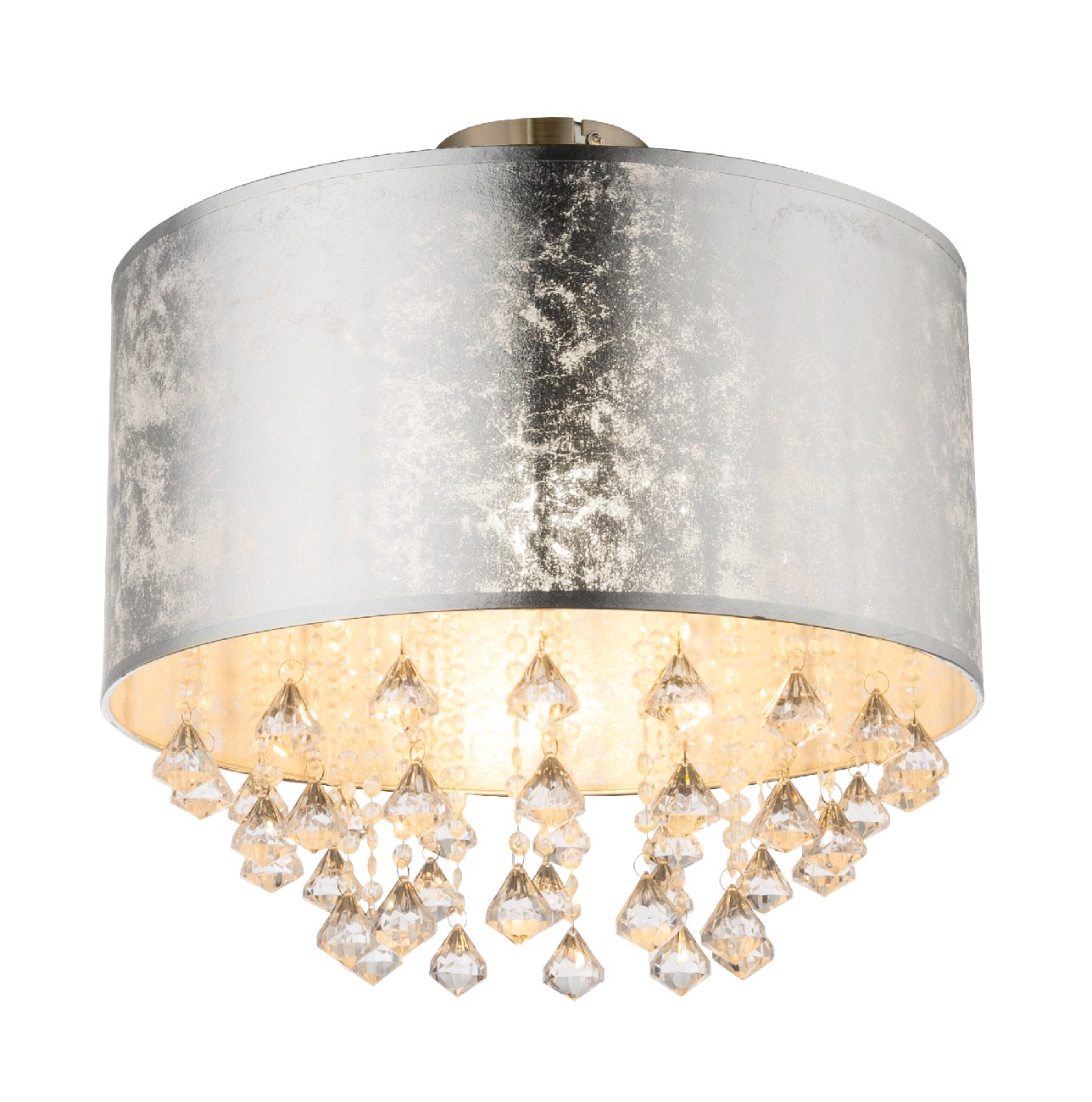 Ova plafonska lampa serije Amy I je pogodna za sobe različitih veličina, prečnika 40 cm. Srebrno obojeni tekstilni abažur ima metalni finiš i dobija dodatni sjaj zahvaljujući različitim providnostima. Gusta postavka akrilnih kristala prelama svetlost i stvara male duge na plafonu i zidovima. Svetiljka ima grlo E27. Sijalica nije uključena u obim isporuke.