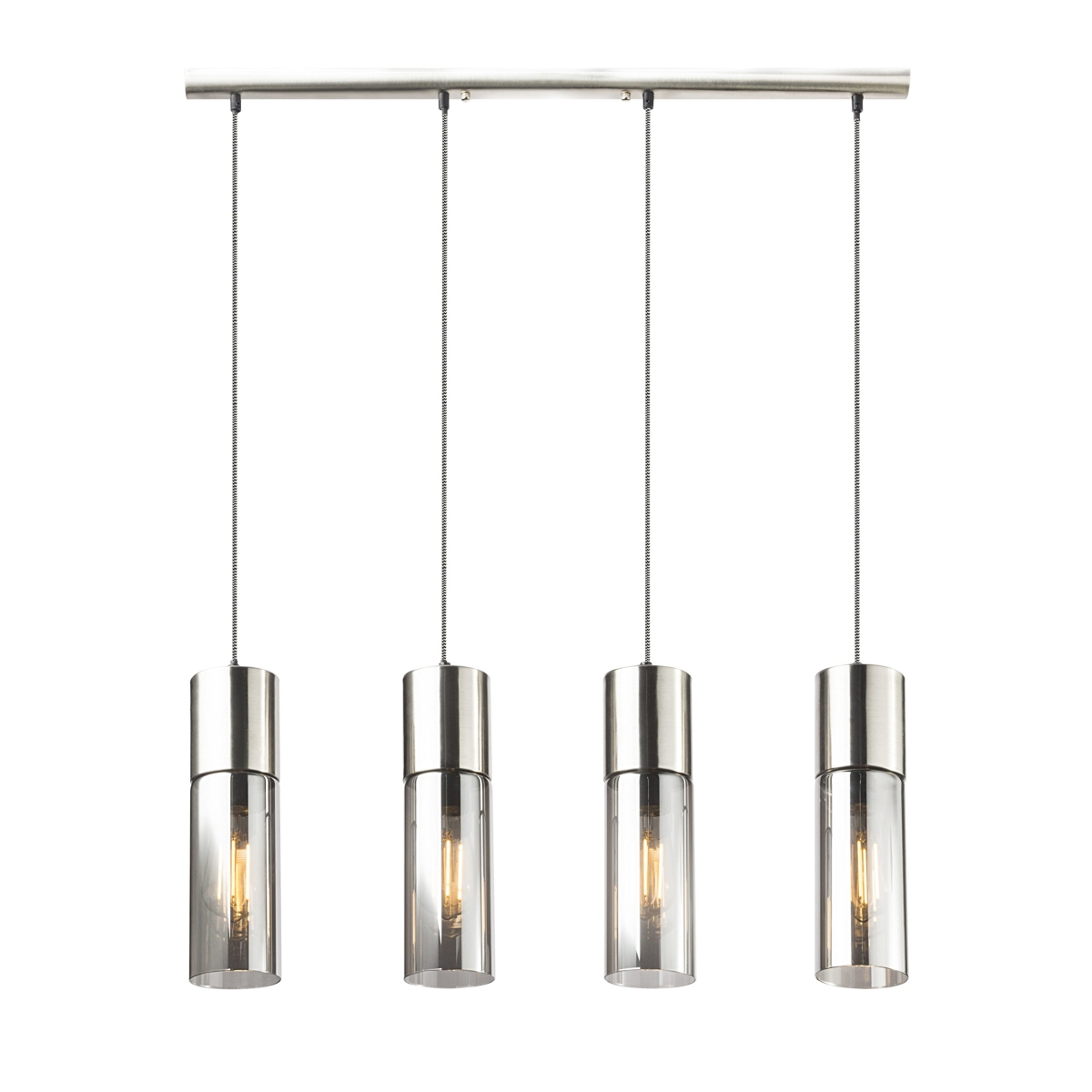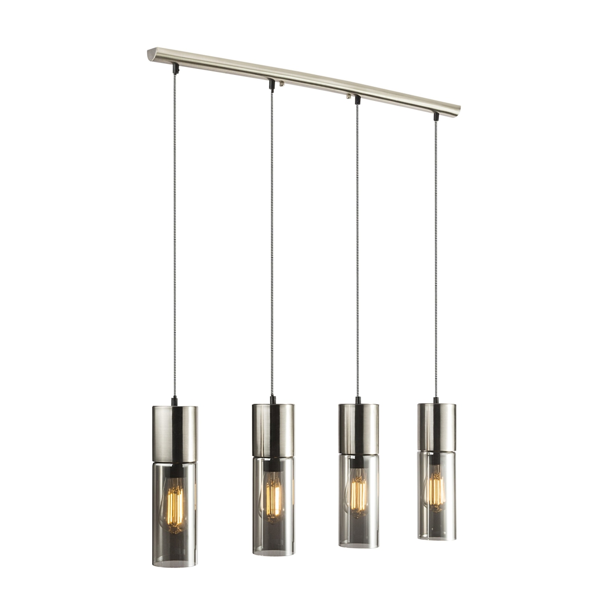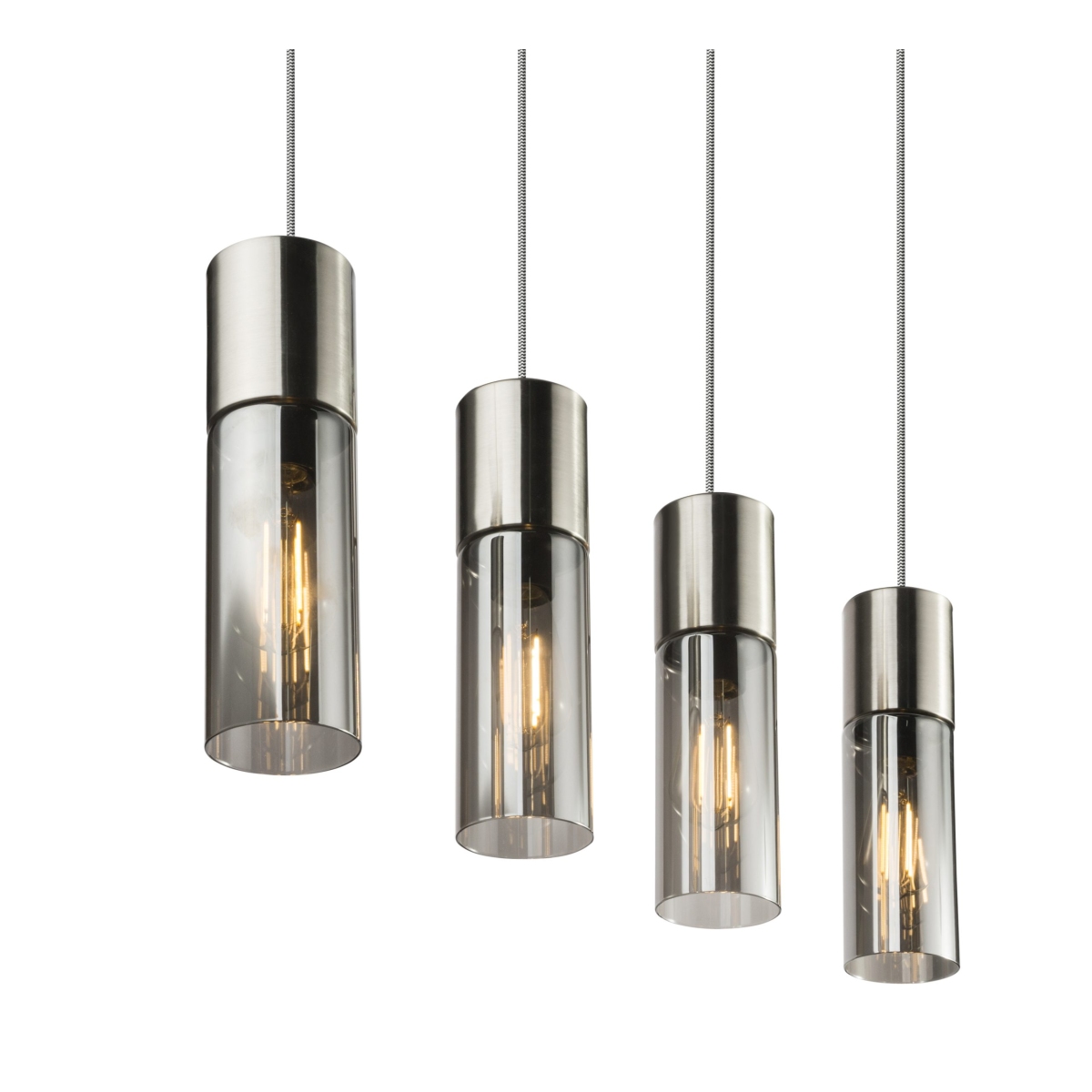 Nikl-mat visilica ANNIKA ističe se jednostavnošću i elegancijom. Četiri cilindrične svetiljke savršeno se uklapaju u moderne dnevne sobe. Abažuri su napravljeni od zatamnjenog stakla, kada uključite lampu, možete videti sijalice kako nežno sijaju. Ovi svetli abažuri vise na metalnoj šipki dugačkoj 80 centimetara. Naročito kao lampa preko pulta ili trpezarijskog stola, ovaj model kao savremeni izvor svetlosti privlačiće poglede. Zahvaljujući E27 grlu, možete sami odrediti izvor svetlosti, kao i boju svetla i svetli intenzitet. Preporučujemo LED sijalice zbog njihove trajnosti i uštede energije. Lampu možete jako dobro kombinovati sa drugim proizvodima iste serije.