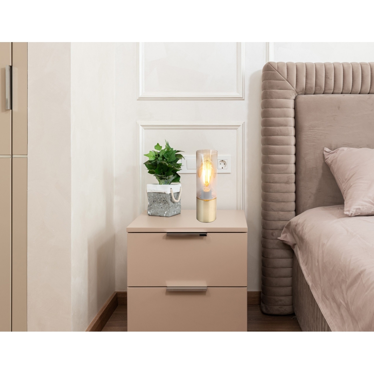 Kompaktno ugrđena mesingana mat stona lampa ANNIKA (visoka 30cm), ima diskretan dizajn i zbog toga se može integrisati u bilo koju prostoriju. Cilindrični abažur (ø 9cm) je napravljen od ćilibarskog stakla, kada se uključi, sijalica sija veoma delikatno. Vrhunac ove lampe je u tome što ima prekidač za dodir. Ovo vam omogućava da lako uključite i isključite lampu. S obzirom na to da je lampa opremljena E27 grlom, možete odrediti osvetljenje do maksimalno 25 vati, kao i boju svetla i svetleći intenzitet. Preporučujemo LED sijalice zbog njihove uštede energije i dugovečnosti. ANNIKA se divno integriše kao lampa pored kreveta, ali se može postaviti i na bočne stolove u dnevnim boravcima, gde stvara udobno osvetljenje.