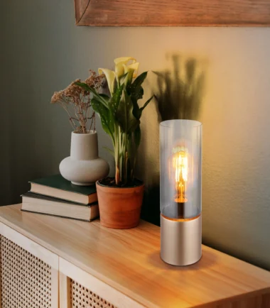 ANNIKA stona lampa – elegantno osvetljenje sa praktičnim dodirom. Okrugla ANNIKA stona lampa kombinuje moderan dizajn sa funkcionalnošću. Cilindrični stakleni abažur i mat metalno kućište boje kapućina daju lampi bezvremenski, elegantan izgled koji se savršeno integriše u širok spektar stilova nameštaja. Sa prečnikom od 90 mm, idealna je za bočne stočiće, noćne stočiće ili kao dekorativno akcentno osvetljenje. Funkcija dodirnog uključivanja/isključivanja obezbeđuje jednostavno rukovanje – nežan dodir je dovoljan da se svetlo uključi ili isključi. Grlo E27 (nije uključeno) vam omogućava da izaberete sijalicu, tako da možete prilagoditi svetlo svojim individualnim potrebama. ANNIKA stona lampa nije samo funkcionalni predmet osvetljenja, već i stilski dizajnerski element za svaki moderni dom.