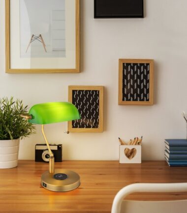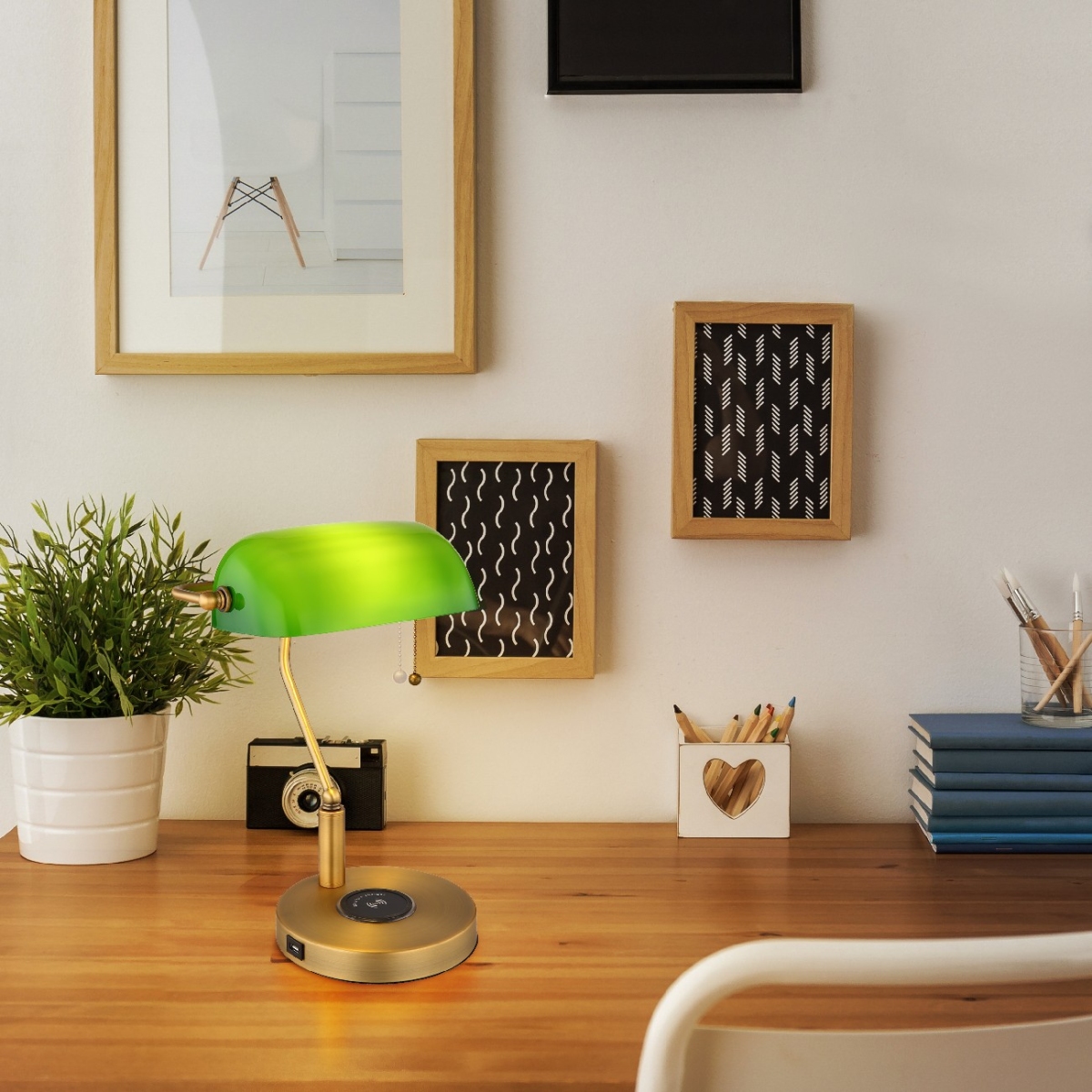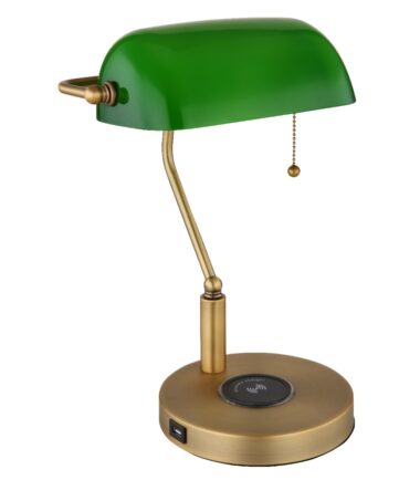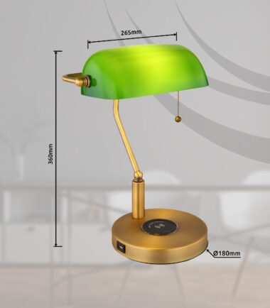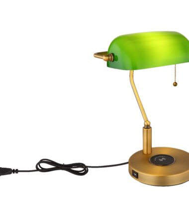 Ova klasična i tradicionalna stilska stona lampa sigurno će se uklopiti u vašim prostorijama. Bilo kao „stara“ stona lampa ili kao ukrasna bankarska lampa, ova 36 cm visoka stona lampa uvek pogđa sa svojim zelenim akrilnim abažurom i odgovarajućom podlogom lampe u boji mesinga. Ima kabl za povezivanje dugačak 1,5 metara i prekidač za uključivanje/isključivanje, što njegovu primenu čini fleksibilnom. Dostupno E14 grlo vam omogućava da slobodno izaberete izvor svetlosti (max.40W). Lampa ima USB kabl sa 5W-1A i funkciju bežičnog punjenja. Ova funkcija vam omogućava da punite telefon ili druge pametne uređaje dok koristite lampu.