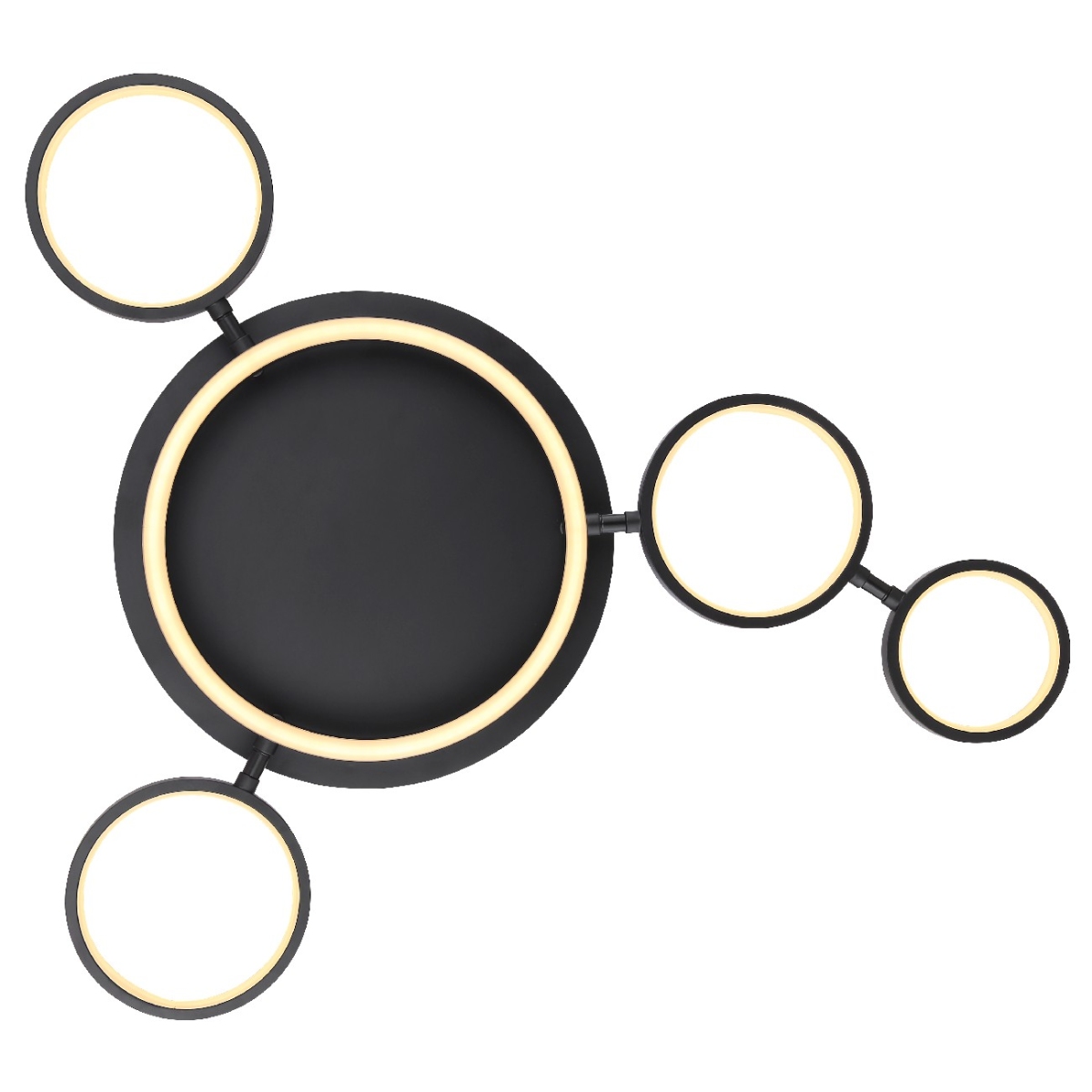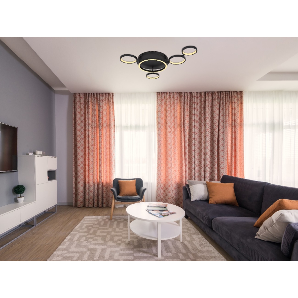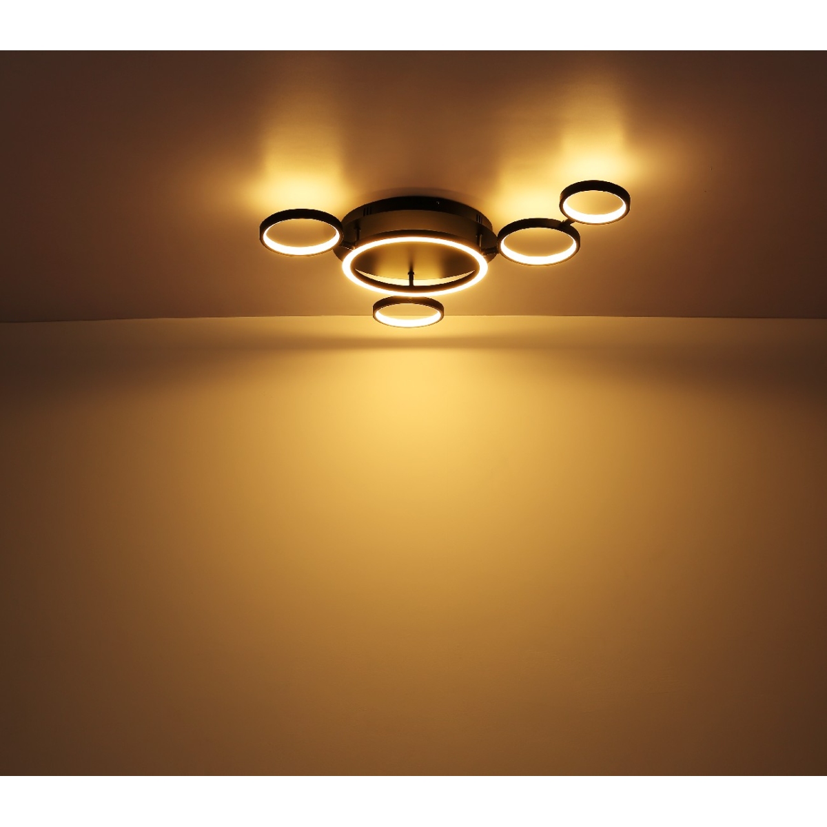 Ova plafonska lampa serije ANTONIUS izdvaja se po izuzetnom i modernom dizajnu i postaje centar vašeg enterijera. Lampa se sastoji od pet crnih prstenova u različitim veličinama, svaki sa LED panelom, koja emituje prijatno toplo belo svetlo (3000 Kelvina) i takođe je podesiva po visini.