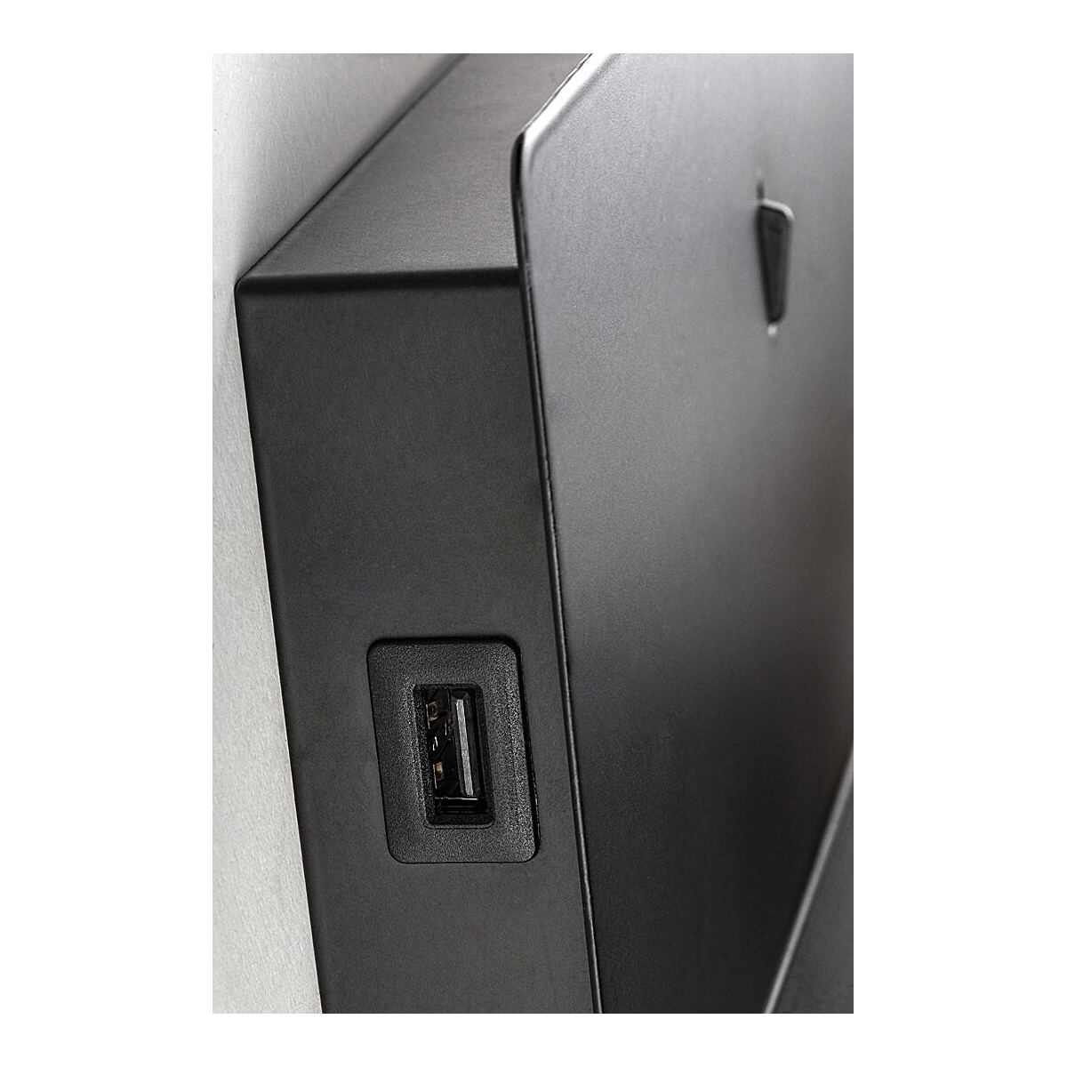 Moderna, praktična zidna lampa Aranzo može biti dobar izbor u dnevnoj sobi, spavaćoj ili radnoj sobi. Ovaj metalni model crne boje ne nudi samo rešenje za osvetljenje, već funkcioniše i kao polica i oprema za punjenje: Aranzoov horizontalni element u obliku slova L ima mesta za malu cilindričnu lampu, pored toga nudi bezbedno postavljanje za vaš mobilni dok punjenje. Naime, deo lampe koji je pričvršćen za dekorativno postolje i naslonjen na zid ima USB port kojim možete udobno puniti svoj mrtvi mobilni uređaj, na dohvat ruke noću ili tokom rada. Ova zidna lampa ima ugrađeni LED izvor svetlosti energetske klase G snage 6 V, svetlosnog toka od 230 lumena sa senkom i 365 lumena bez senke, i životnog veka od 20.000 sati. Izvor svetlosti ima temperaturu boje od 3000 K i shodno tome zrači toplo belo svetlo. Širina Aranza je 250 mm, visina 130 mm, rastojanje od zida 150 mm, prečnik lampe 70 mm.