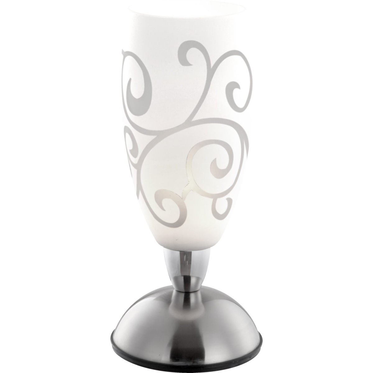 Ova zanimljiva stona lampa može se postaviti kako na komodu u hodniku, tako i na bočni sto u dnevnoj sobi. Sastoji se od mat nikl-pločaste baze i svetlećeg stakla u obliku pehara sa ukrasnom šarom. U kombinaciji sa modernim stilom nameštaja, pruža akcentovano dodatno osvetljenje. Ova oblikovana stona lampa ima prekidač za uključivanje/isključivanje.