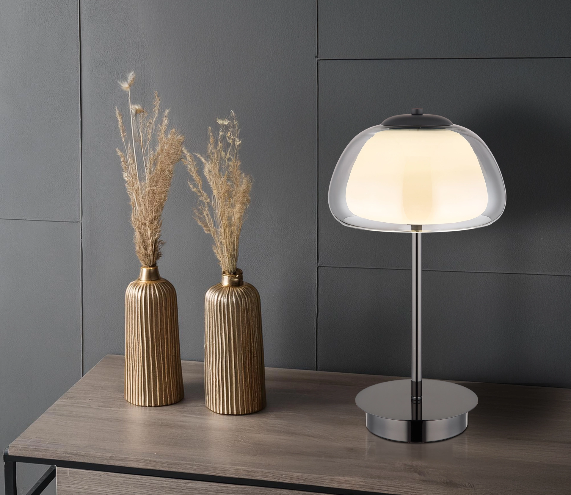 Okrugla stona lampa AVILA kombinuje moderan dizajn sa naprednom tehnologijom. Telo napravljeno od crnog i hromiranog metala daje lampi plemenit izgled koji se savršeno usklađuje sa dimljenim staklom i opalnim unutrašnjim staklom. Ova viseća lampa nije samo privlačna za oko, već nudi i praktične funkcije za maksimalnu udobnost. Pomoću priloženog daljinskog upravljača možete kontinuirano prigušiti osvetljenost i fiksirati boje kako biste stvorili idealno osvetljenje za svaku situaciju. Ugrađena funkcija memorije čuva vaše omiljene predefinisane postavke svetla, dok praktični prekidač na kablu pruža dodatne opcije kontrole. Stona lampa AVILA stvara prijatan efekat osvetljenja sa izlazom od 1050 lumena. Zahvaljujući CCT funkciji, možete prilagoditi temperaturu boje od toplih 2700 K do hladnih 6500 K kako biste stvorili savršenu atmosferu u svom životnom prostoru.
