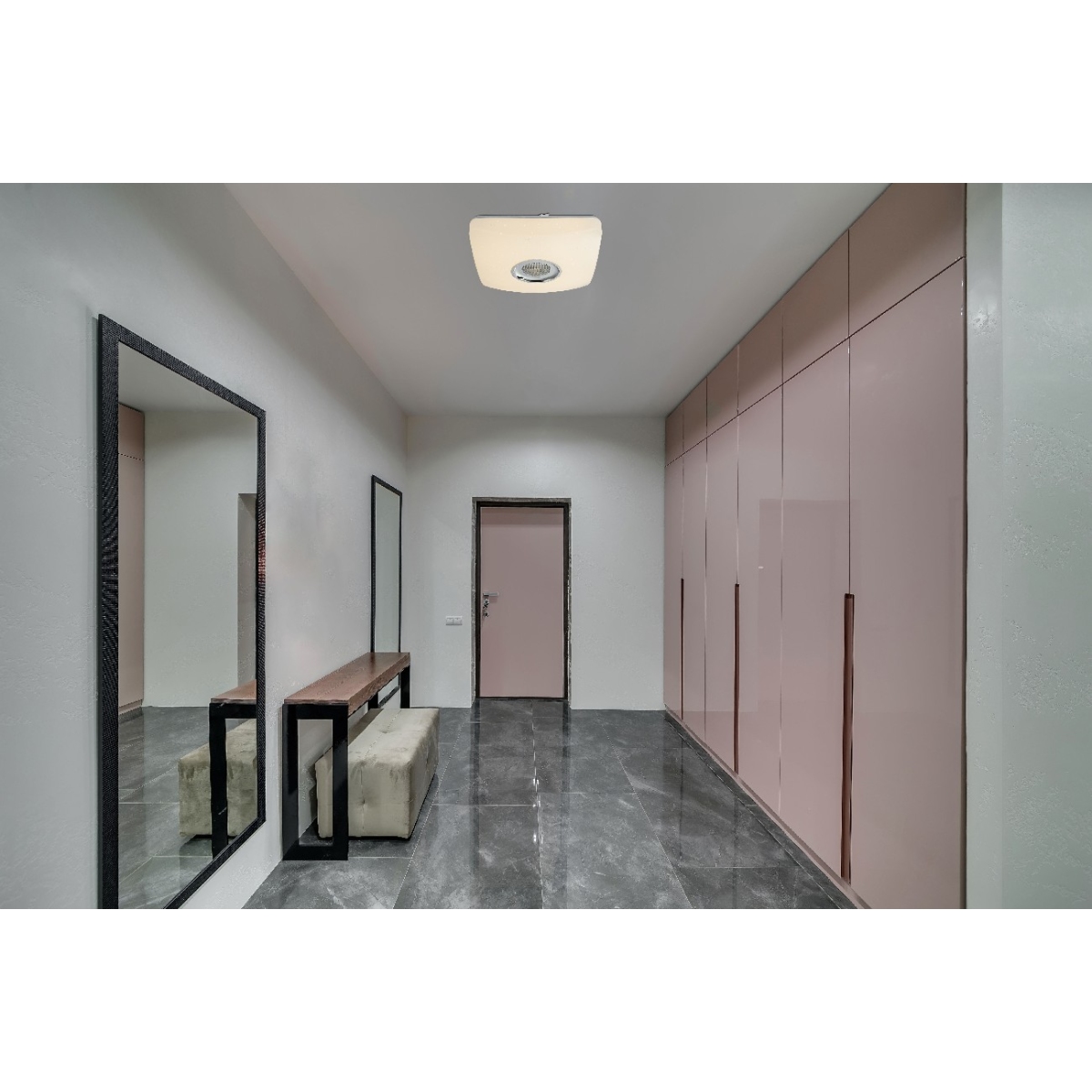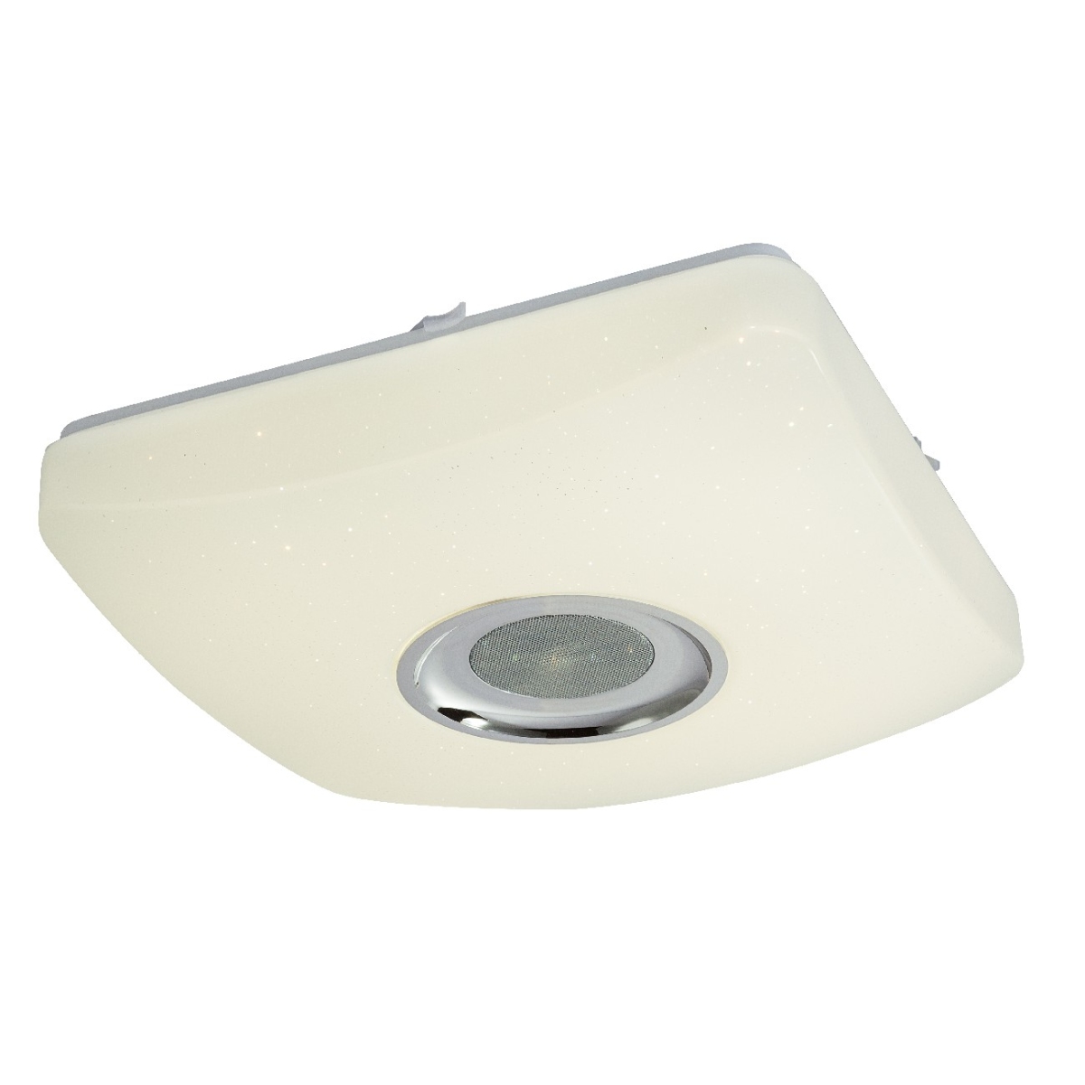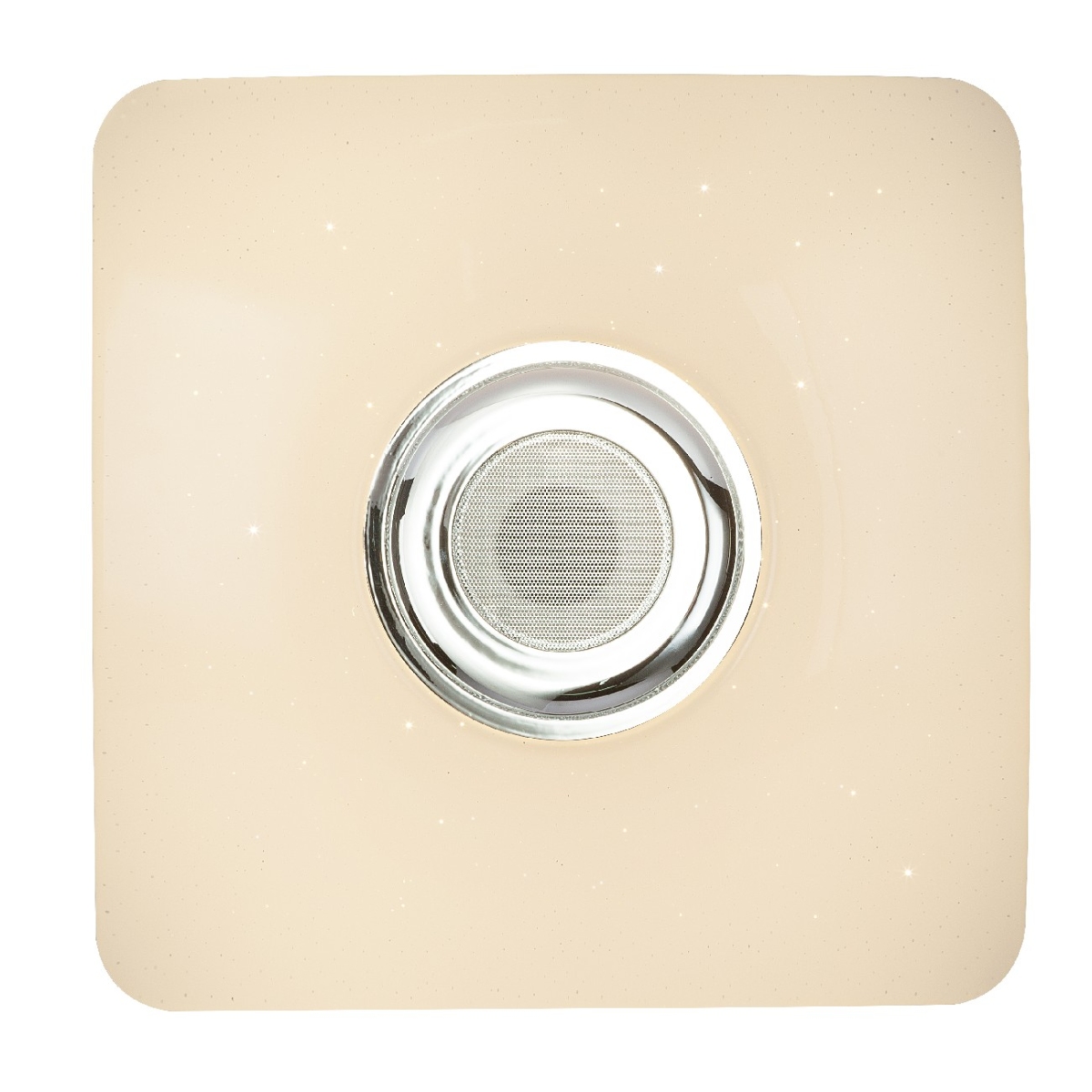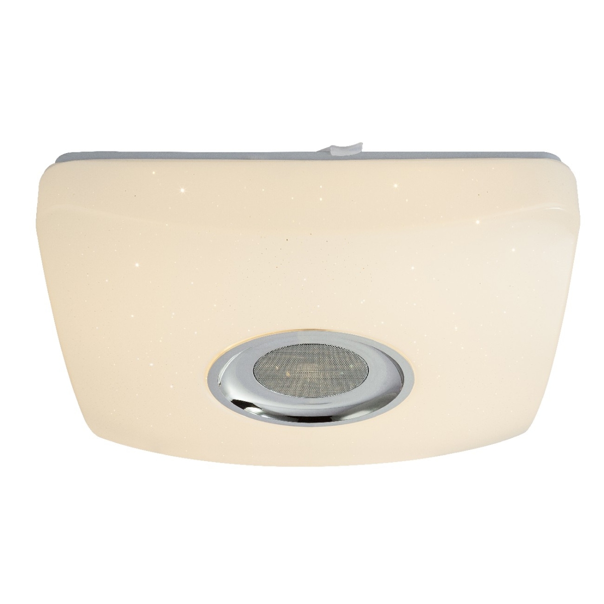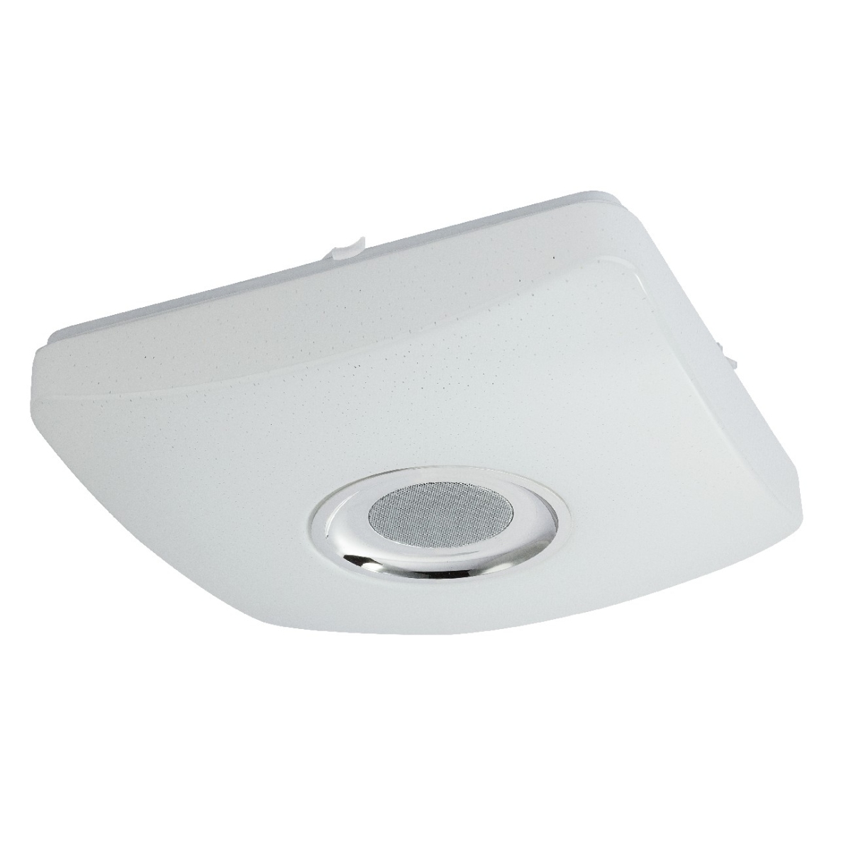 Kvadratna (37 x 37cm) plafonska lampa AYLEEN ističe se svojim funkcionalnostima. Napravljena od bele i opalne plastike, ova plafonska lampa ima zvučnik od 5W. Veza preko Bluetooth-a i besplatne aplikacije vam omogućavaju da puštate željenu muziku preko ove plafonske lampe. Pomoću priloženog daljinskog upravljača, boja svetla prigušiti do maksimalnih 1120 lumena i fiksirati između toplo bele 3000 Kelvina i hladno bele 6000 Kelvina. U zavisnosti od vaših potreba i raspoloženja, svetlo se takođe može prebaciti na crvenu, zelenu ili plavu boju.