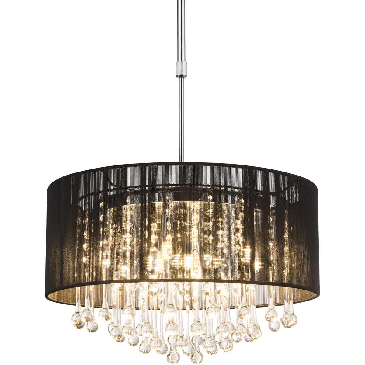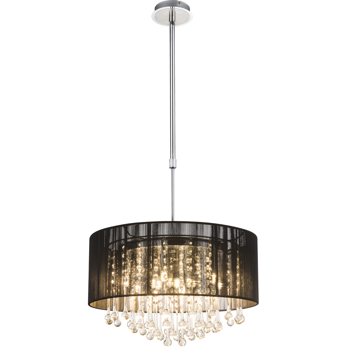 Sa ovom pompeznom visećom, serija BAGANA, svetlucavi akcenti su postavljeni. Okrugli abažur (prečnika 50 cm) prekriven crnom svilom na kome su okačeni providni, svetlucavi stakleni kristali, privlači poglede u svakom životnom prostoru. Ova plafonska lampa je podesive visine (75cm-115cm) zbog svog inteligentnog, prelepog nosača u hromu. Dvanaest uključenih, zamenljivih 3W LED sijalica pružaju prijatno toplo belo svetlo od 3000K. Druga mogućnost je da vam ista serija proizvoda ponudi izbor sličnih plafonskih lampi.
