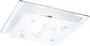 Jednostavna staklena plafonjera dimenzija 33,5×33,5×8,5 sa dva sijalična grla upotpuniće svaki prostor
