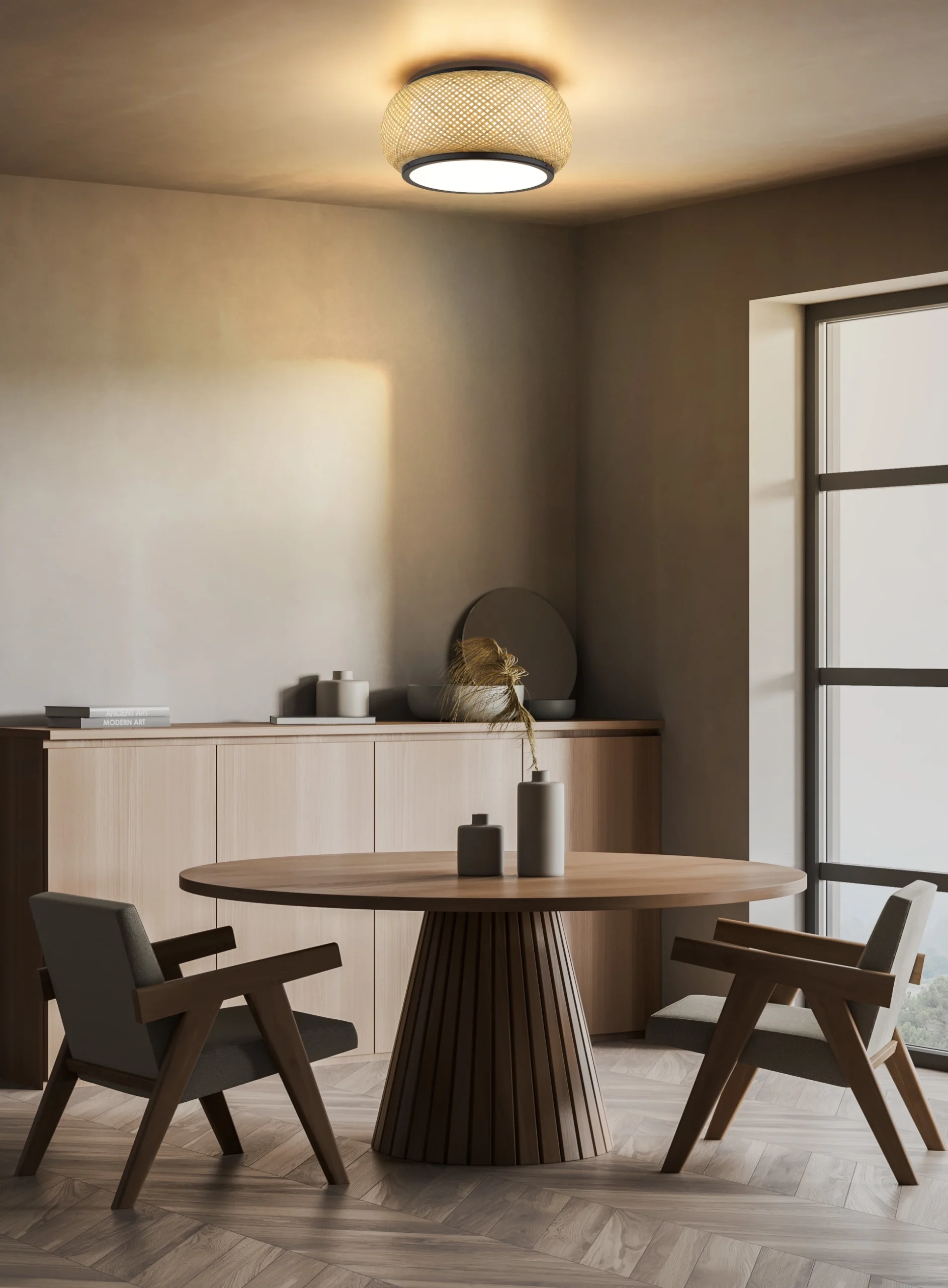 Plafonska lampa BAMBORA kombinuje vintage šarm sa modernim komforom, stvarajući topao, domaći utisak sa svojim lukovičastim, okruglim prirodnim bambusovim abažurom. Mat crni metalni okvir stvara stilski kontrast prirodnom bambusovom tkanju, upotpunjenim opalno belim akrilom i difuzorom od bele tkanine. Sa prečnikom od 380 mm, BAMBORA je idealna za udobne dnevne sobe, hodnike ili spavaće sobe. Integrisana LED tehnologija isporučuje 1560 lumena, pružajući prijatno i efikasno osvetljenje. Temperatura boje se može glatko podešavati između toplo bele (3000 K) i dnevne bele (6000 K) (CCT funkcija). Pomoću memorijske funkcije, vaša poslednja podešavanja se mogu lako pozvati, a pojedinačne boje se mogu fiksirati. BAMBORA tako spaja vintage dizajn sa praktičnim, modernim karakteristikama – savršena plafonska lampa za udoban dom.