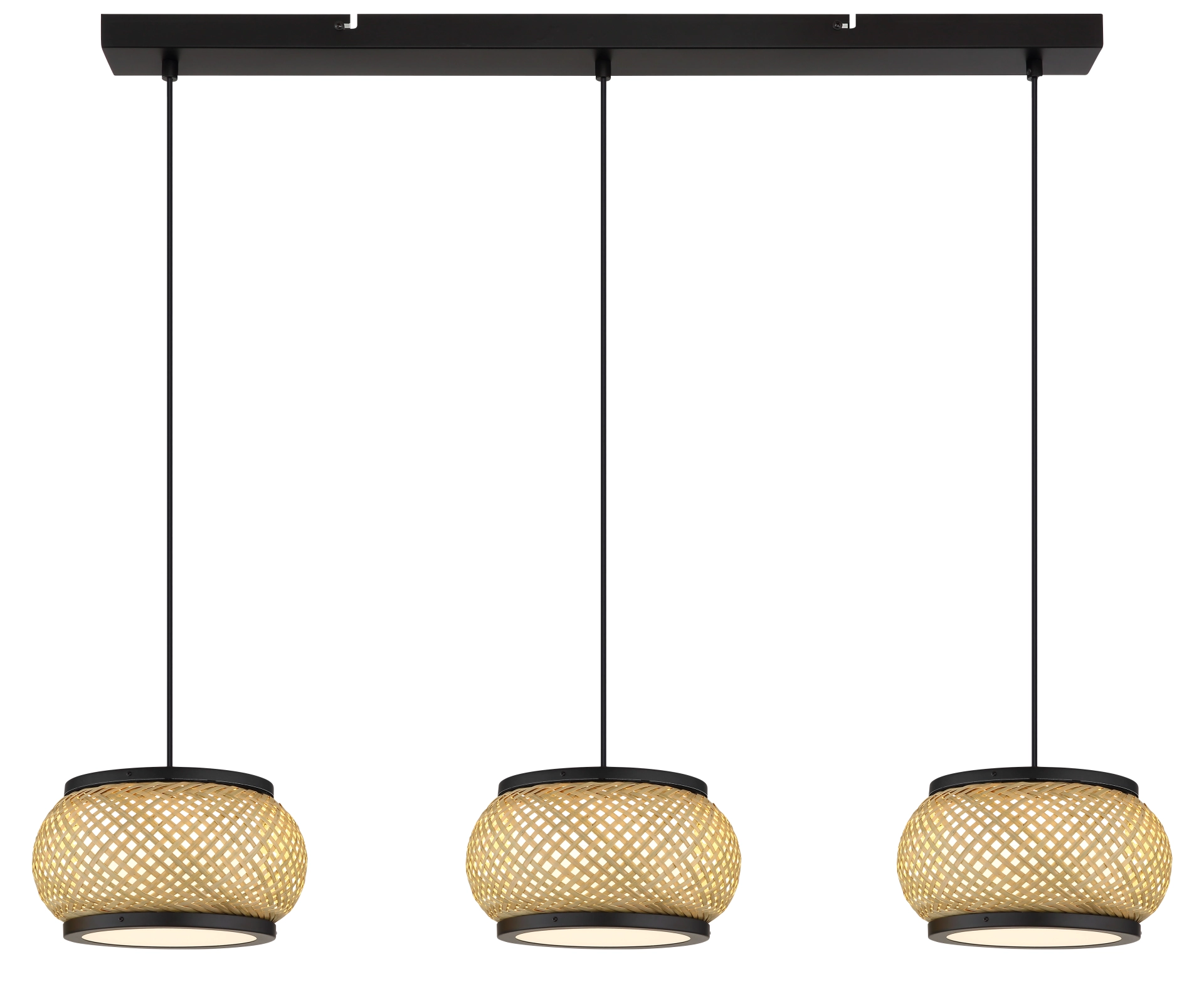 Viseća lampa BAMBORA elegantno kombinuje vintage šarm sa modernom tehnologijom. Ravna šina drži tri lukovičasta abažura napravljena od prirodnog bambusovog tkanja, upotpunjena belim tekstilnim oblogama – stvarajući toplu, organsku fokusnu tačku iznad trpezarijskog stola ili u kuhinji. Mat crni metalni okvir pruža stilski kontrast prirodnoj estetici bambusa, dajući svetiljci premium osećaj. Sa dimenzijama 1000 × 220 mm i snagom od 2340 lumena, BAMBORA pruža svetlo, ali atmosfersko osvetljenje. Njena integrisana LED tehnologija obezbeđuje efikasno i dugotrajno osvetljenje. Zahvaljujući CCT funkciji, temperatura boje se može glatko podešavati između 3000 K (toplo bela) i 6000 K (dnevno bela). Pojedinačne boje se mogu fiksirati, a funkcija memorije bez napora poziva poslednje podešavanje.