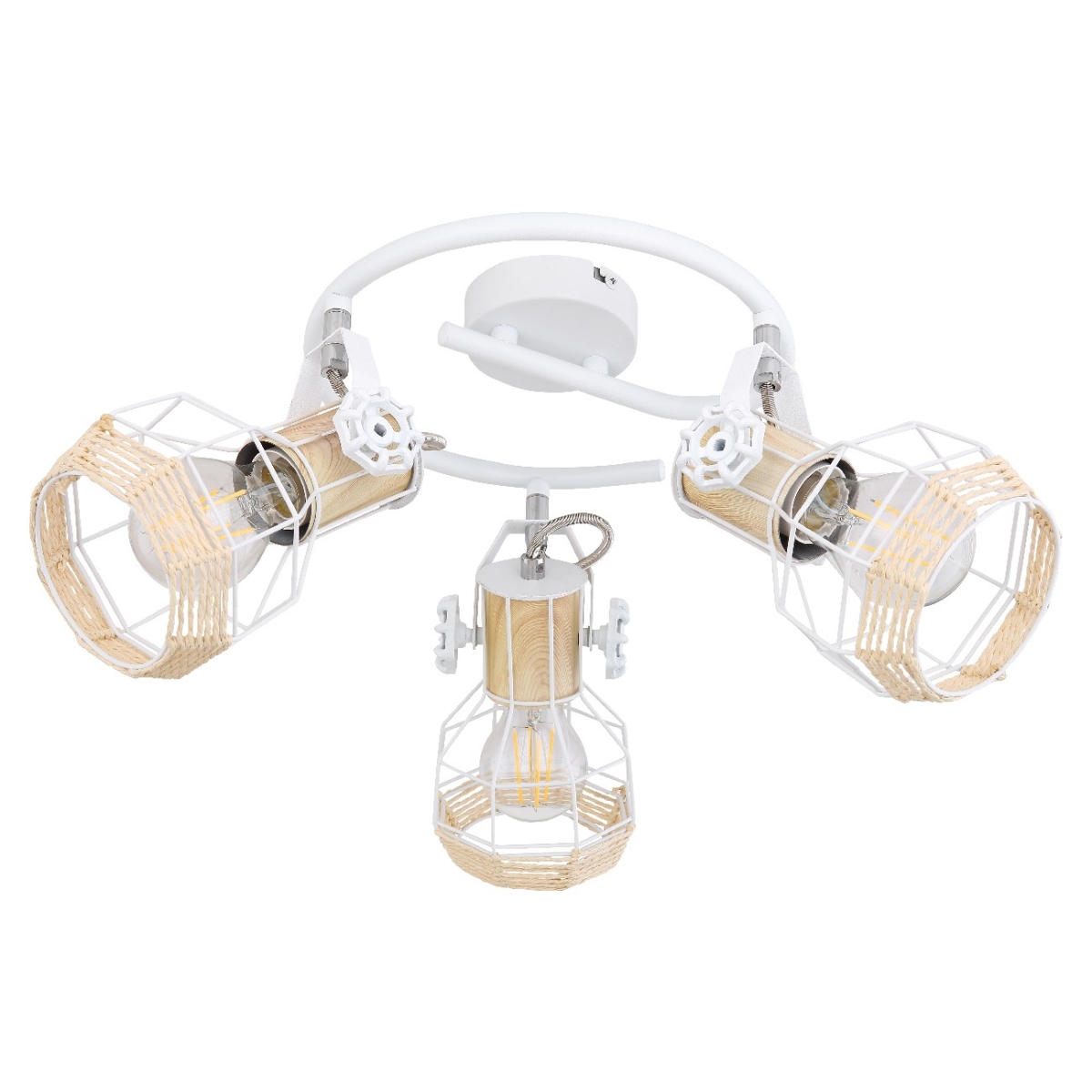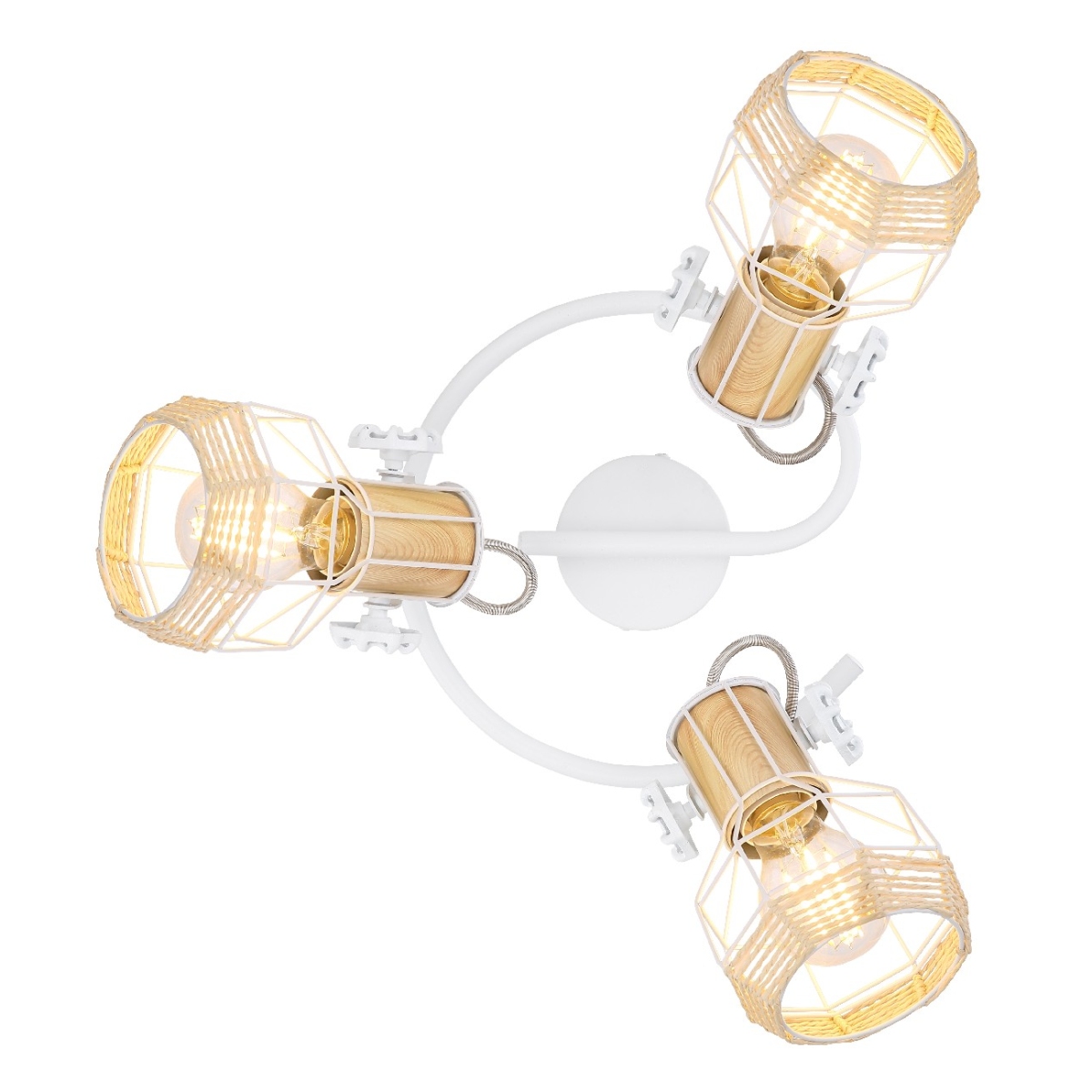 Ovaj reflektor serije BANA (Ø 25cm) kombinuje moderno sa retro izgledom. Beli metal i prirodno drvo u kombinaciji sa prirodnim abažurima u boji čine ovu lampu privlačnom za vaše oči. Tri reflektora, koja se nalaze na luku u obliku slova e, ukrašena su vizuelno efikasnim kontrolnim točkovima na metalnom kućištu. Zbog slobodnog izbora izvora svetlosti (3xE27/max. 40W) možete sami odrediti svetli intenzitet i boju svetla ove unutrašnje lampe. Zbog njihove dugovečnosti i uštede energije preporučujemo LED sijalice.