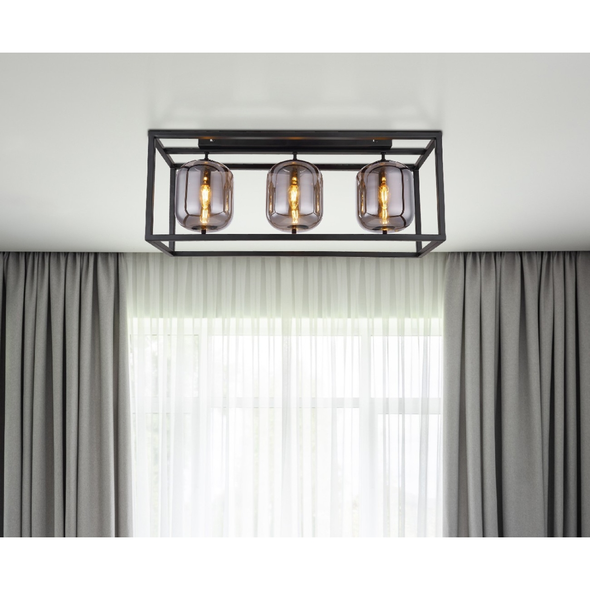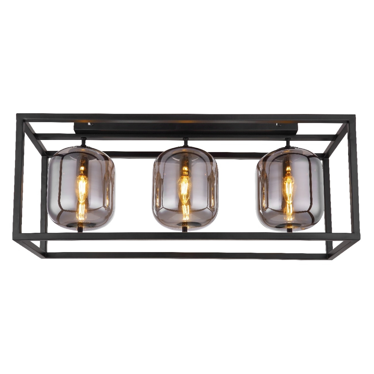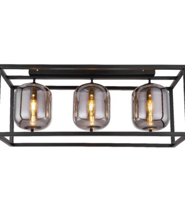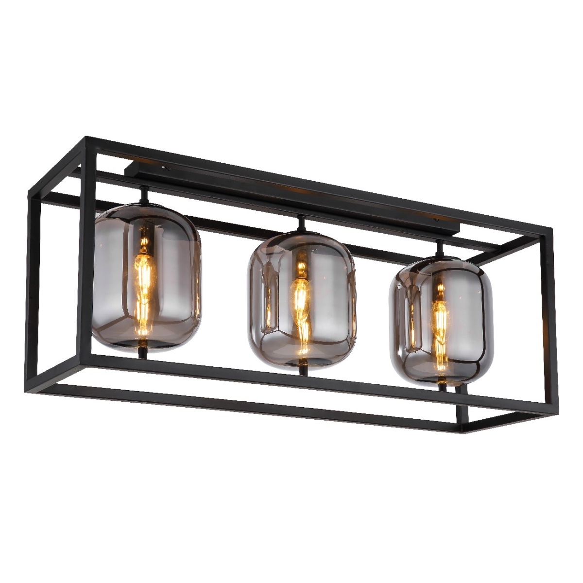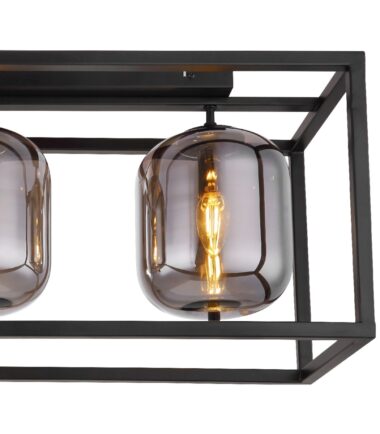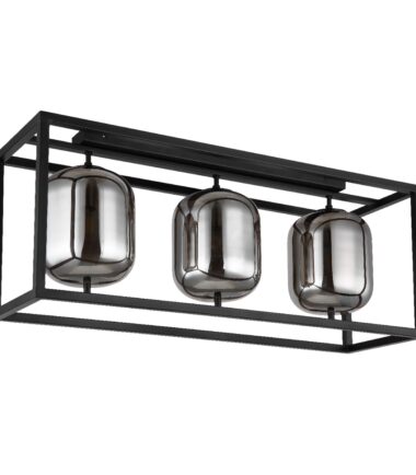 Ova moderna plafonska lampa BLACKY serije ubeđuje sjajnim dizajnom. Na pravougaonom metalnom kavezu (77 x 25 cm) u mat crnoj boji nalazi se tri E14 grla, od kojih je svako prekriveno oblikovanom staklenom kuglom u boji dima. Grla E14 vam omogućavaju da sami odredite boju svetla i jačinu do maksimalnog izlaza od 40 vati. Zbog dugovečnosti i uštede energije preporučujemo LED sijalice.