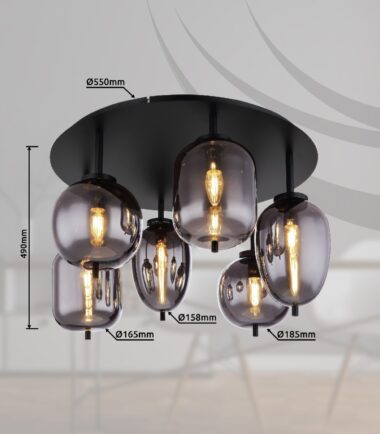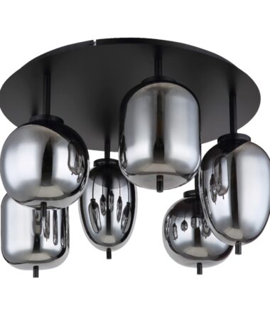 Ova predivna visilica serije BLACKY impresionira svojim dizajnom i postaje centar vašeg životnog prostora. Sastoji se od šest staklenih kugli u boji dima različite veličine i oblika, svaka sa grlom E14 koja vise sa plafonske mesingane osnove na 6 šipki u mat crnoj boji. Grla E14 vam omogućavaju da sami odaberete sijalice, max. 40W, a samim tim i odredite boju svetla i jačinu. Upotpunite sliku u vašem prostoru uz ostale modele iz ove serije.