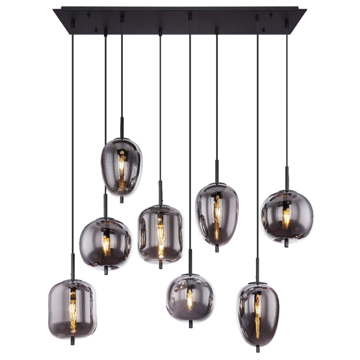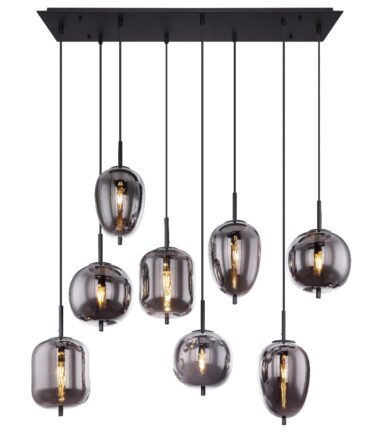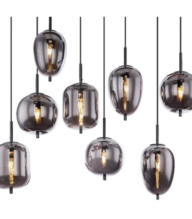 Ova visilica BLACKY je napravljena od crnog metala sa staklenim kuglama u boji dima. Osam visećih kugli su individualne po svom obliku i veličini. Ova 120cm isturena, umetnička lampa ima osam E14 grla (sa maksimalno 40 vati), koje omogućavaju slobodan izbor sijalica. Zbog njihove dugovečnosti i uštede energije preporučujemo LED sijalice. Ova visilica je idealna za vaš dnevni boravak i trpezariju.