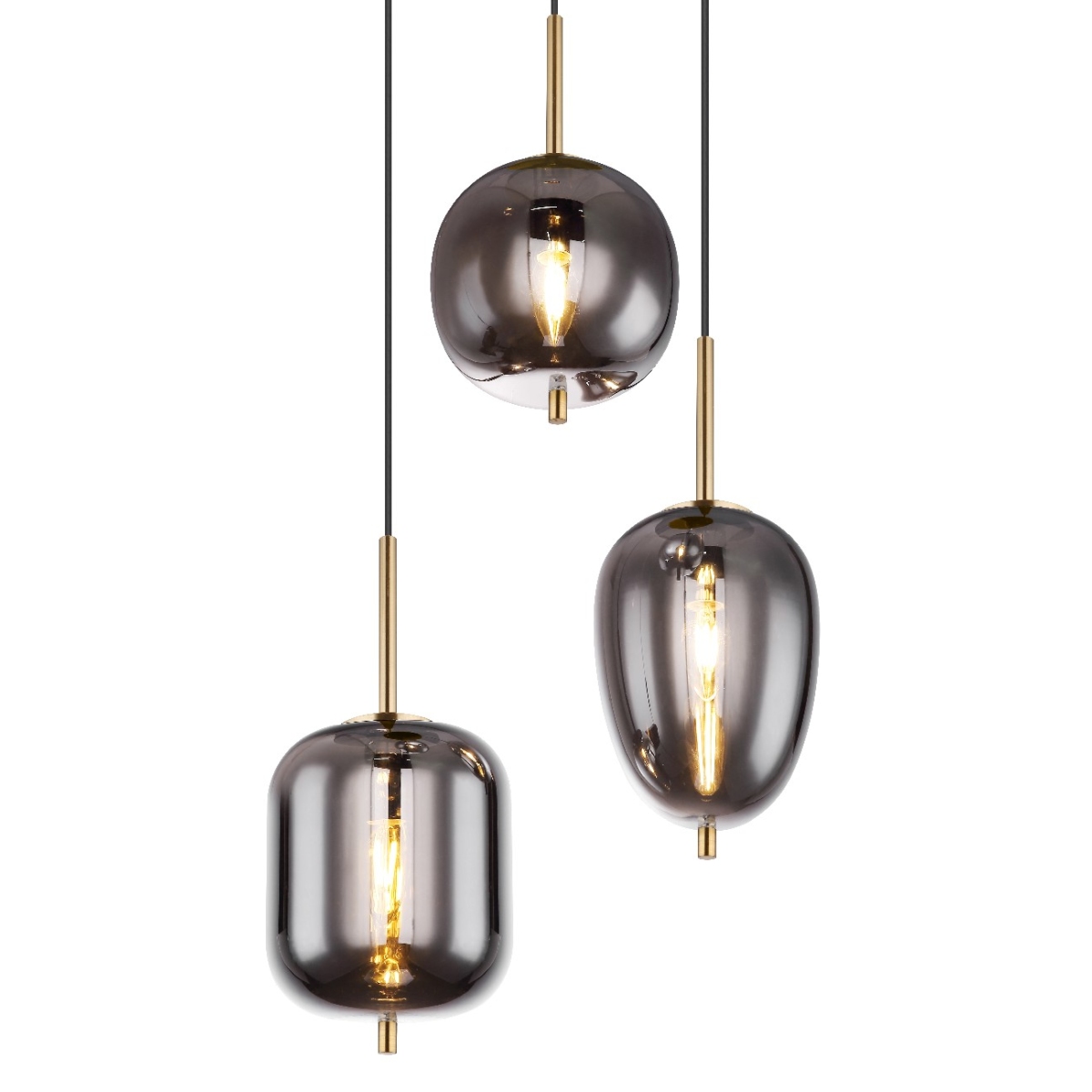 Ova viseća lampa (ø 46 cm) je predivan dodatak vašem enterijeru. Sastoji se od okrugle metalne ploče u boji mesinga sa koje vise tri crna kabla sa staklenim kuglama u boji dima različitih oblika. Ona su takođe opremljena metalnim elementima u boji mesinga i mogu biti opremljeni E14 sijalicama po vašem izboru, što vam pruža mogućnost da pojedinačno odredite boju svetla i jačinu. Pored toga, visinu možete podesiti i do 120 cm tokom montaže. Pomoću ove visilice možete postaviti elegantne akcente u svoja četiri zida i upotpuniti celokupnu sliku.