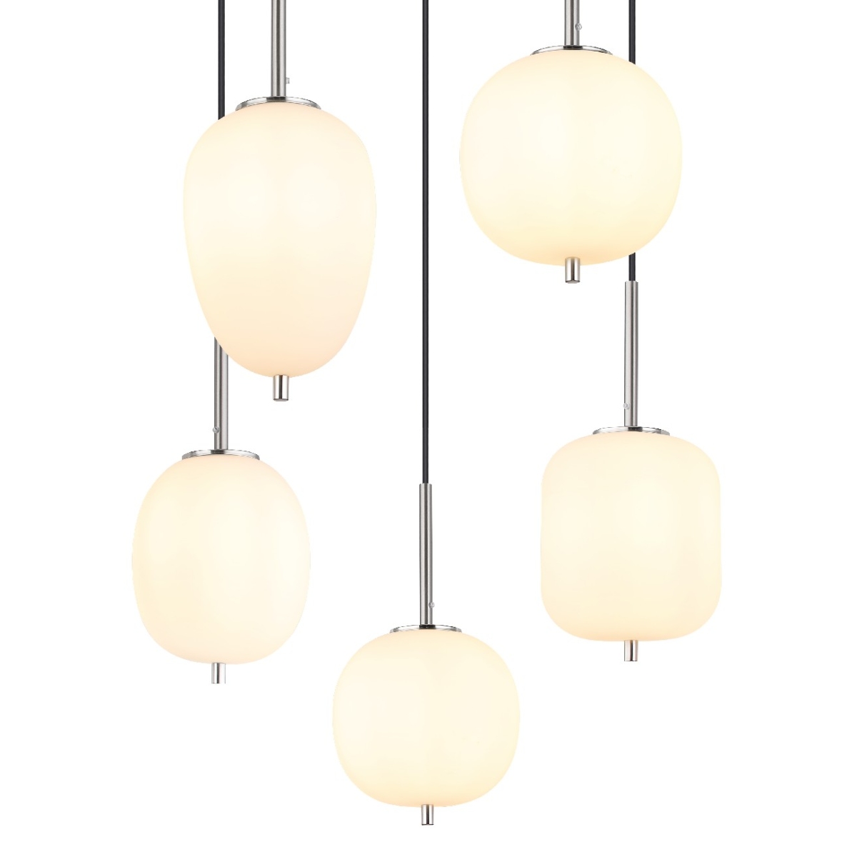 Oblikovana visilica serije BLACKY I inspiriše mlade i stare. Od okruglog plafonskog nosača u boji nikla, 5 kablova se nastavljaju 1,5 m od plafona i svaki se završava na E14 grlu. Svako E14 grlo ima opalno staklo različitih oblika i pruža odličnu celokupnu sliku. Grla E14 vam omogućavaju da sami odredite boju svetla i jačinu do maksimalnog izlaza od 40 vati. Postavite nove akcente u svojim prostorijama.