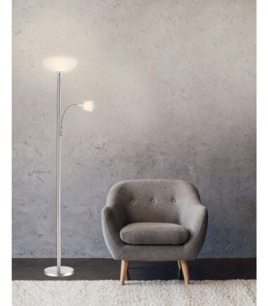 Podna lampa i lampa za čitanje kombinuju se u ovoj lampi od 178 cm. Hromirani nikl mat okvir se savršeno slaže sa satiniranim staklom. Lampa takođe ima prekidač. Svetla sijaju uz pomoć LED sijalice sa E27 grlom od 656 lumena jake i 3000K tople bele svetlosti i LED sijalice sa grlom E14 u jakom svetlu od 195 lumena i 3000K toplom belom svetlošću.