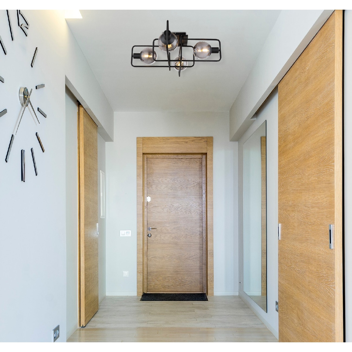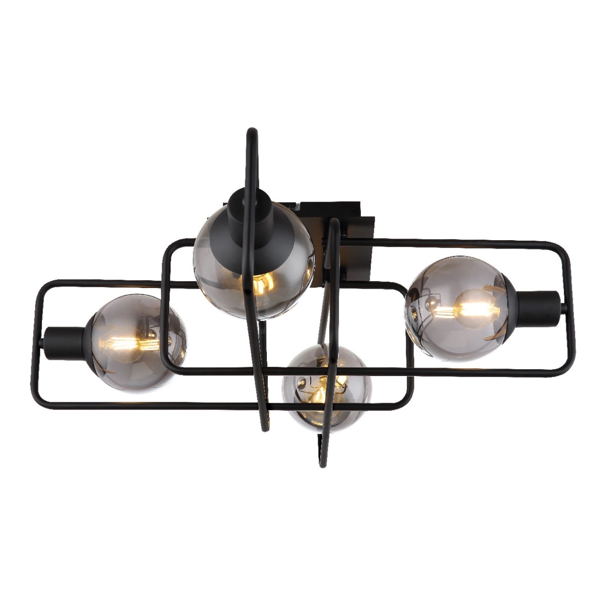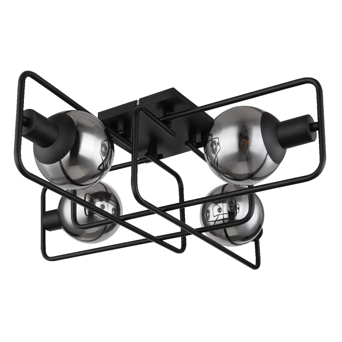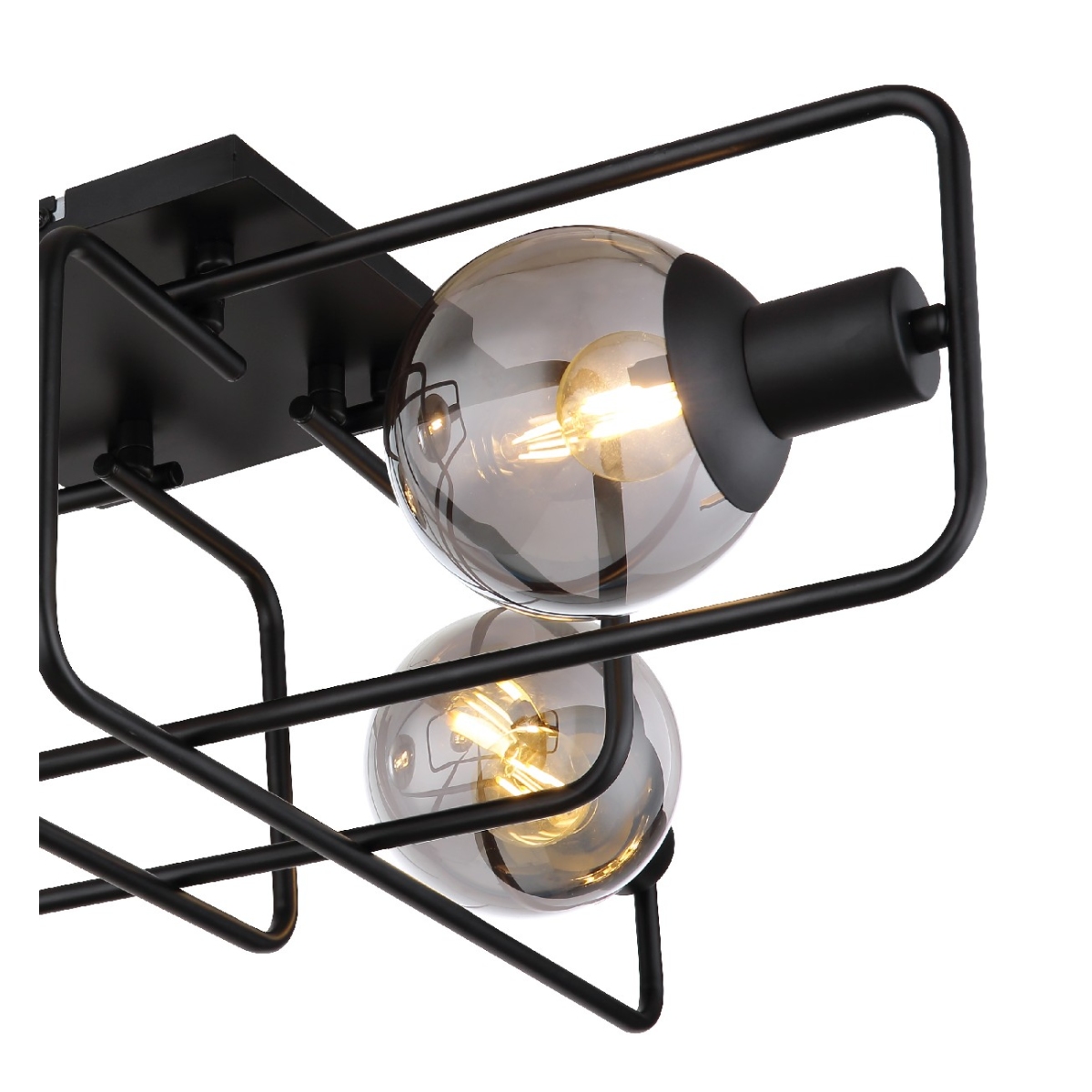 Ova moderna plafonska lampa impresionira svojim jednostavnim dizajnom. Na četiri pravougaone zaobljene metalne šipke (61x61cm) u mat crnoj boji nalaze se E14 grla, preko kojih su stakla u boji dima. Grlo E14 vam daje mogućnost izbora boje svetla i jačine do maksimalne snage od 40W.