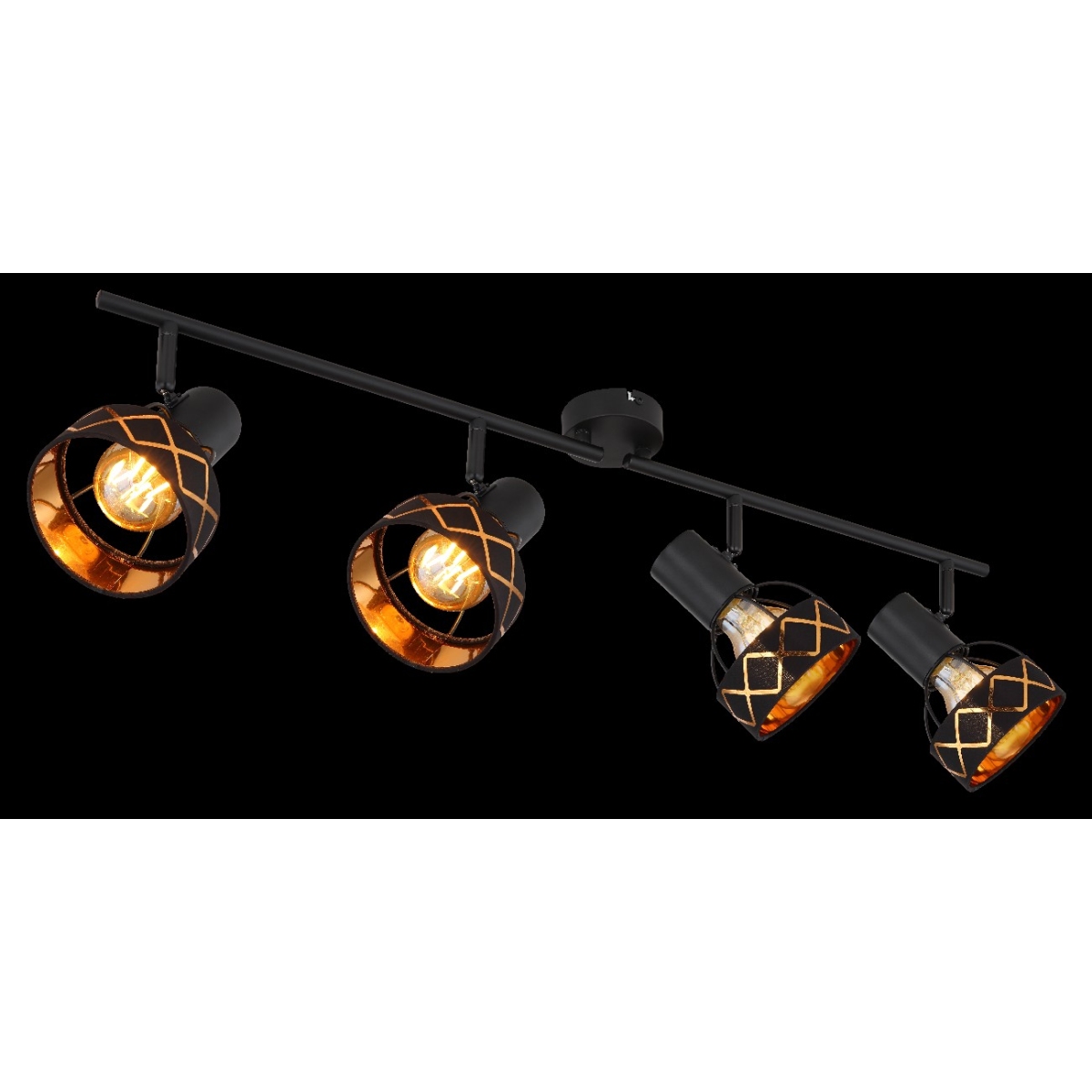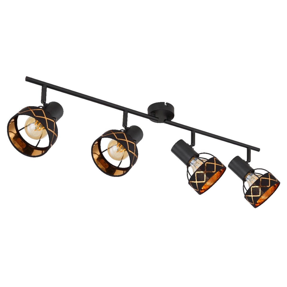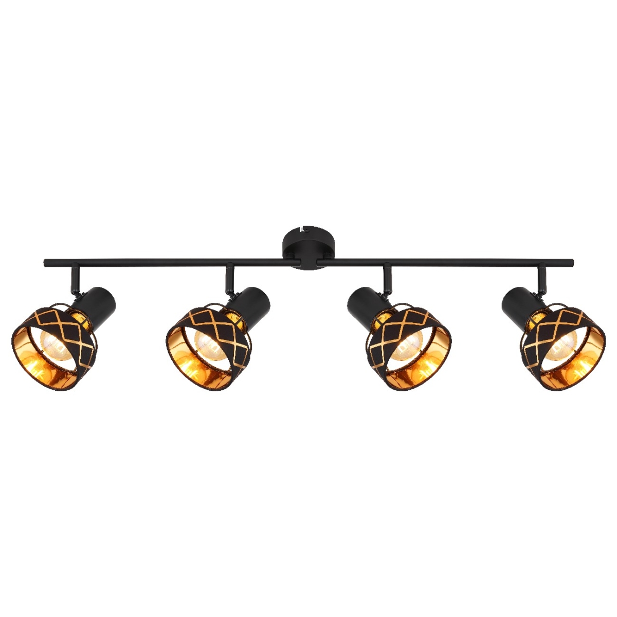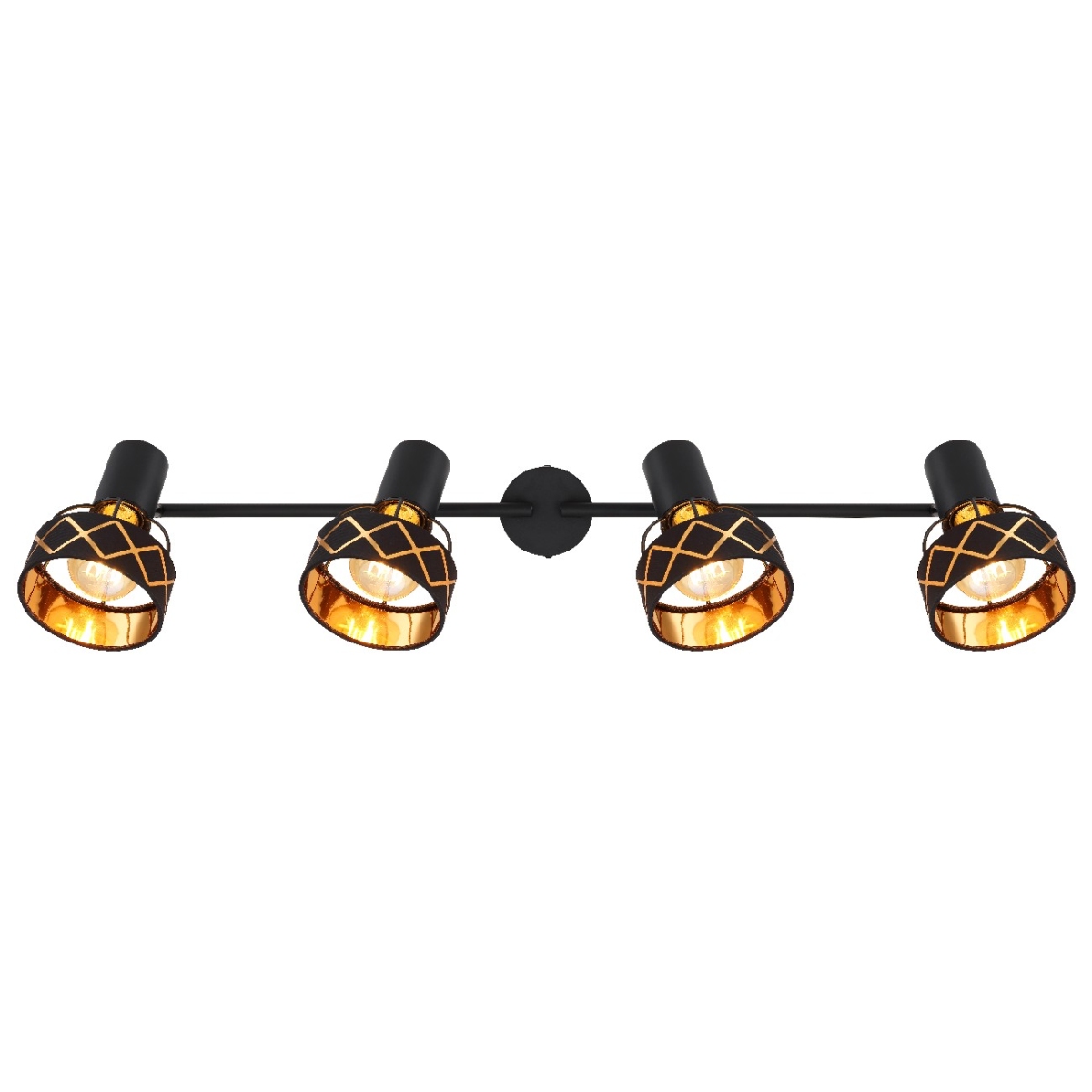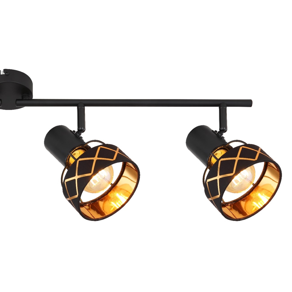 Ovaj plafonski reflektor iz serije BLANCA je divan dodatak vašem enterijeru. Reflektor dužine 80 cm sastoji se od dve crne metalne grane, od kojih svaka ima dva E27 grla i crni tekstilni abažur, koji je tamno zlatan iznutra i imaju linearnu šaru. Grla mogu biti opremljena odgovarajućim sijalicama po vašem izboru, što vam pruža mogućnost da u skladu sa svojim idejama odredite boju svetla i jačinu. Pomoću ostalih artikala iste serije možete da kreirate elegantan ambijent u svoja četiri zida.