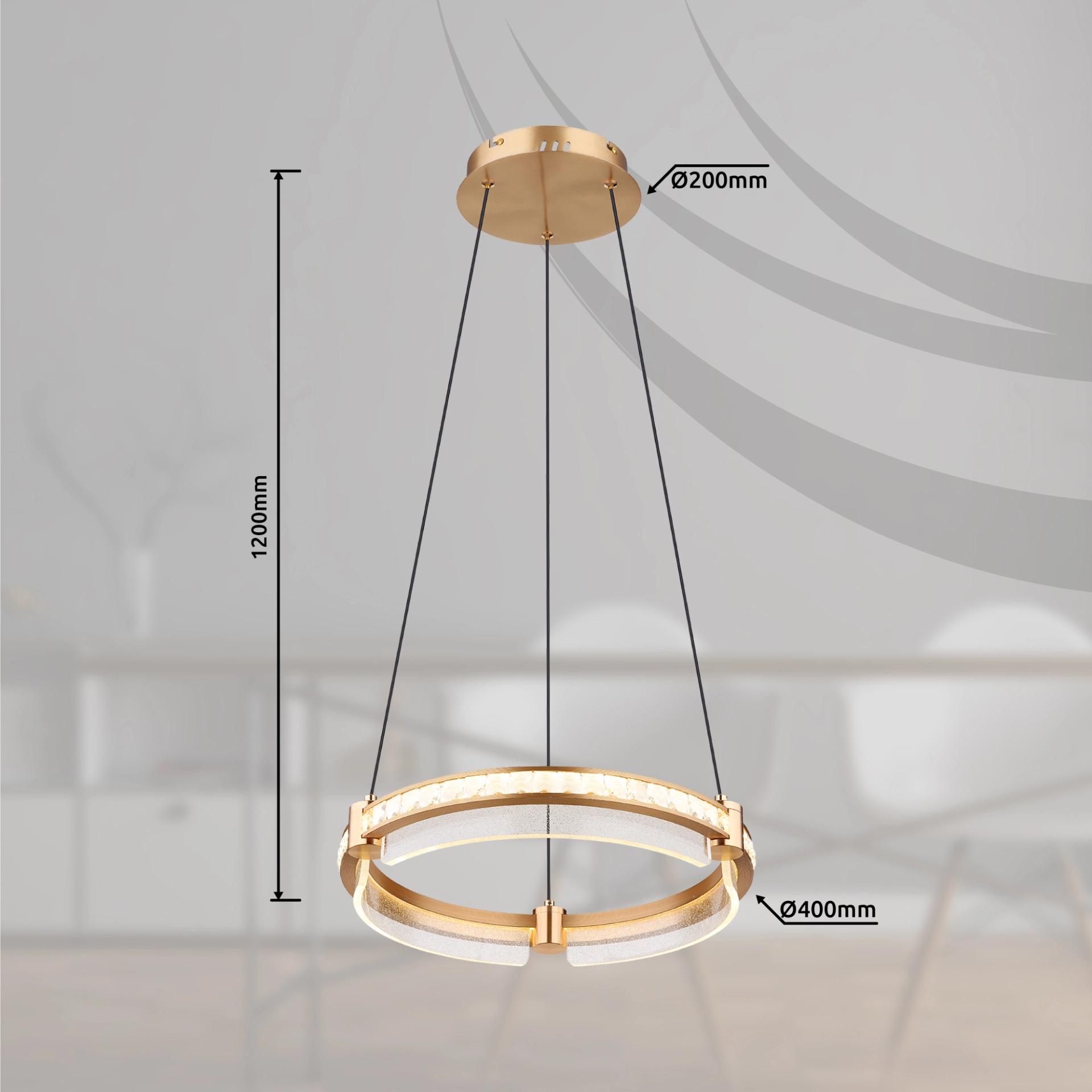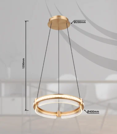 Okrugla viseća lampa BLONDI u obliku prstena je prava atrakcija i daje vašem domu luksuzan izgled. Sa svojim elegantnim dizajnom i visokokvalitetnim materijalima, biće vrhunac u svakoj prostoriji. Telo viseće lampe je napravljeno od aluminijuma boje zlata, koji je brušen kako bi se stvorio elegantan sjaj. Abažur je napravljen od providnih K5 kristala i providnog akrila, koji pruža fascinantno prelamanje svetlosti. Viseća lampa BLONDI dolazi sa praktičnim daljinskim upravljačem koji vam omogućava da lako kontrolišete osvetljenje. Može se prigušiti, tako da možete podesiti osvetljenost po svojoj želji. Pored toga, možete podesiti svoju omiljenu boju, a integrisana funkcija memorije čuva vaša podešavanja. Sa prečnikom od 400 mm, viseća lampa BLONDI proizvodi snaga svetla od 2000 lumena. Zahvaljujući CCT od 2700K do 6000K, imate mogućnost da individualno regulišete boju svetlosti. Sa visećom lampom BLONDI, ne samo da unosite luksuzni dizajn u svoj dom, već i stvarate prijatnu i atmosfersku atmosferu. Uronite svoje sobe u zadivljujuću igru svetlosti i uživajte u luksuznom ambijentu koji ova svetiljka stvara.