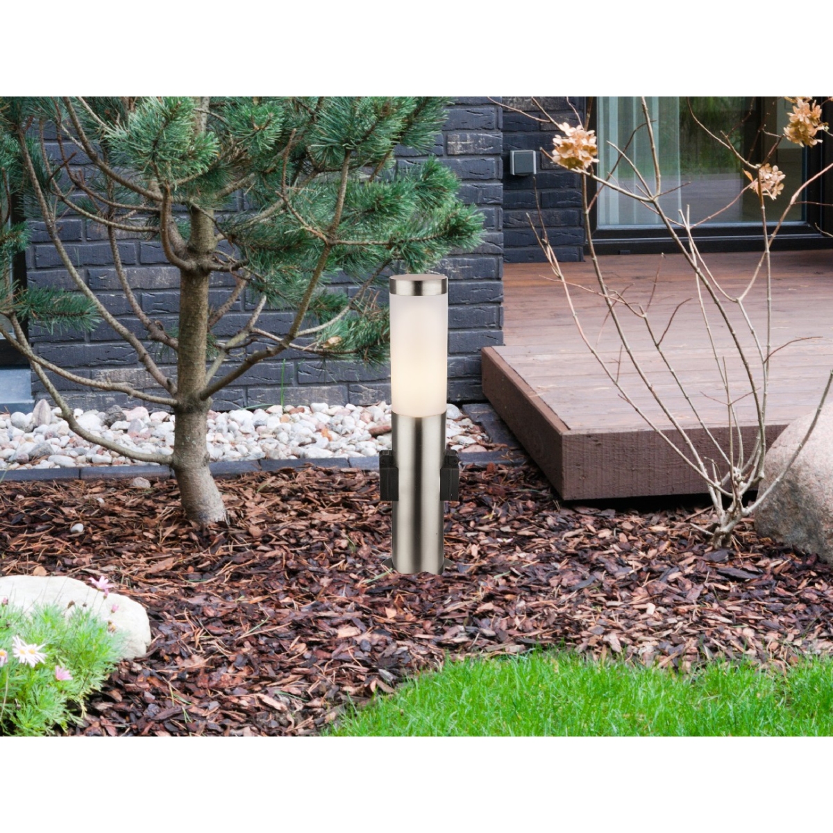 Ovu elegantnu spoljnu lampu iz serije BOSTON karakteriše njen elegantan dizajn i sjajna izrada. Oblikovana spoljašnja lampa idealno je pogodna za upotrebu na otvorenom zbog svog IP44 stepena zaštite. Ovaj model je napravljen od nerđajućeg čelika i opalne plastike i ukupne je veličine 45 cm. Veliki plus su dva postojeća grla u bazi. Lampa je opremljena E27 grlom i omogućava vam da koristite sijalicu (max. 60W) po vašem izboru. Zbog njihove uštede energije i dugovečnosti preporučujemo LED sijalice. Uz ostale osnovne lampe i zidne lampe iste serije proizvoda možete upotpuniti sliku.
