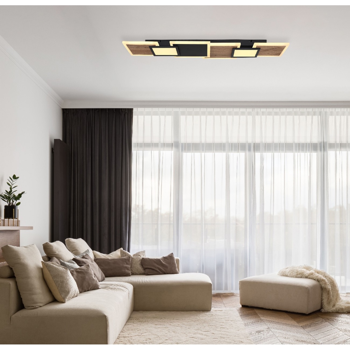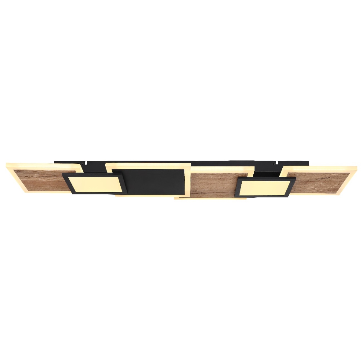 Ova upečatljiva, prelepa plafonska lampa inspiriše sjajnim dizajnom. Na pravougaonoj plafonskoj osnovi postoji šest LED panela u crnoj boji sa ukrasima nalik drvetu, koji sijaju prijatnom 3000 Kelvina toplom belom svetlošću i tako čine prijatnu atmosferu u vašim prostorijama.