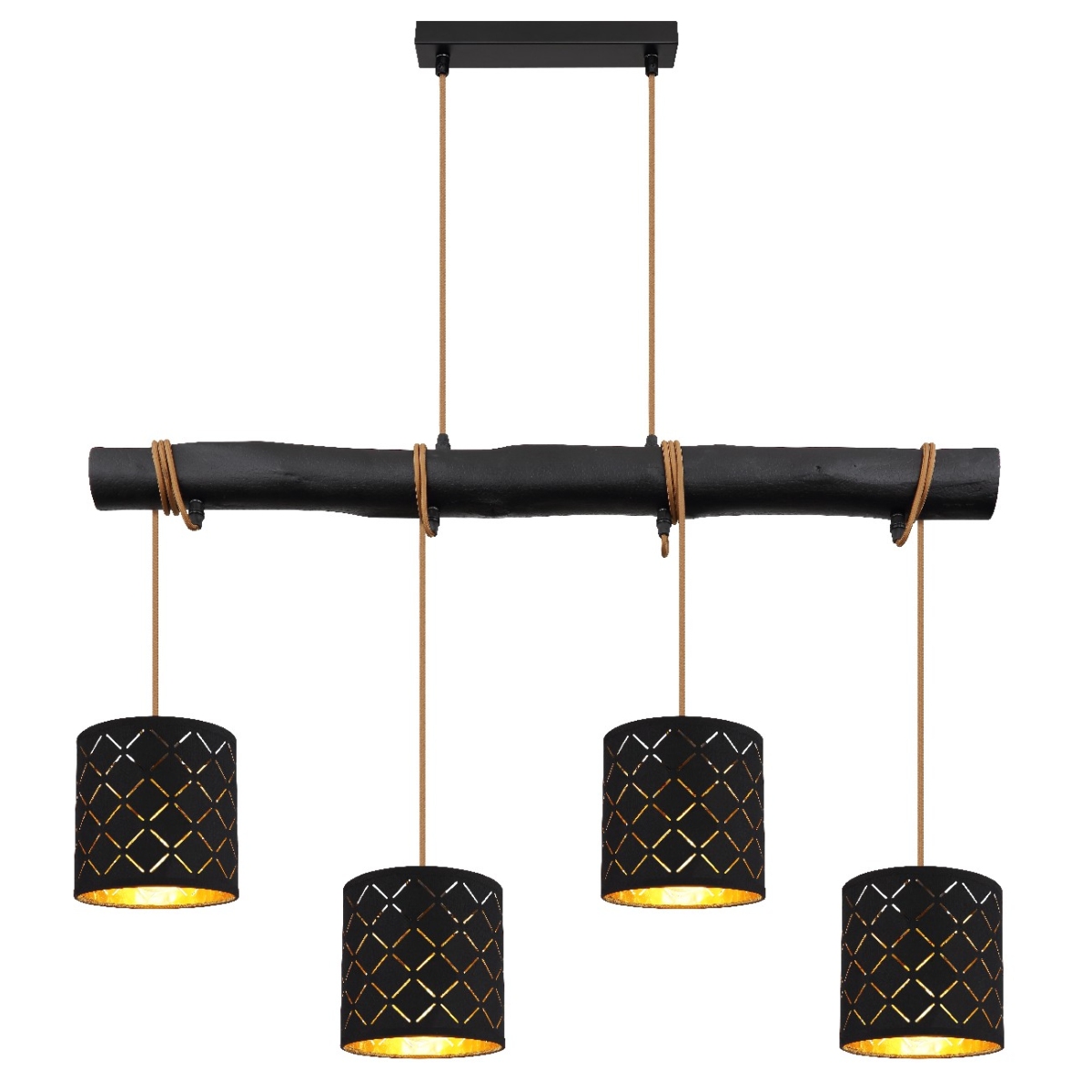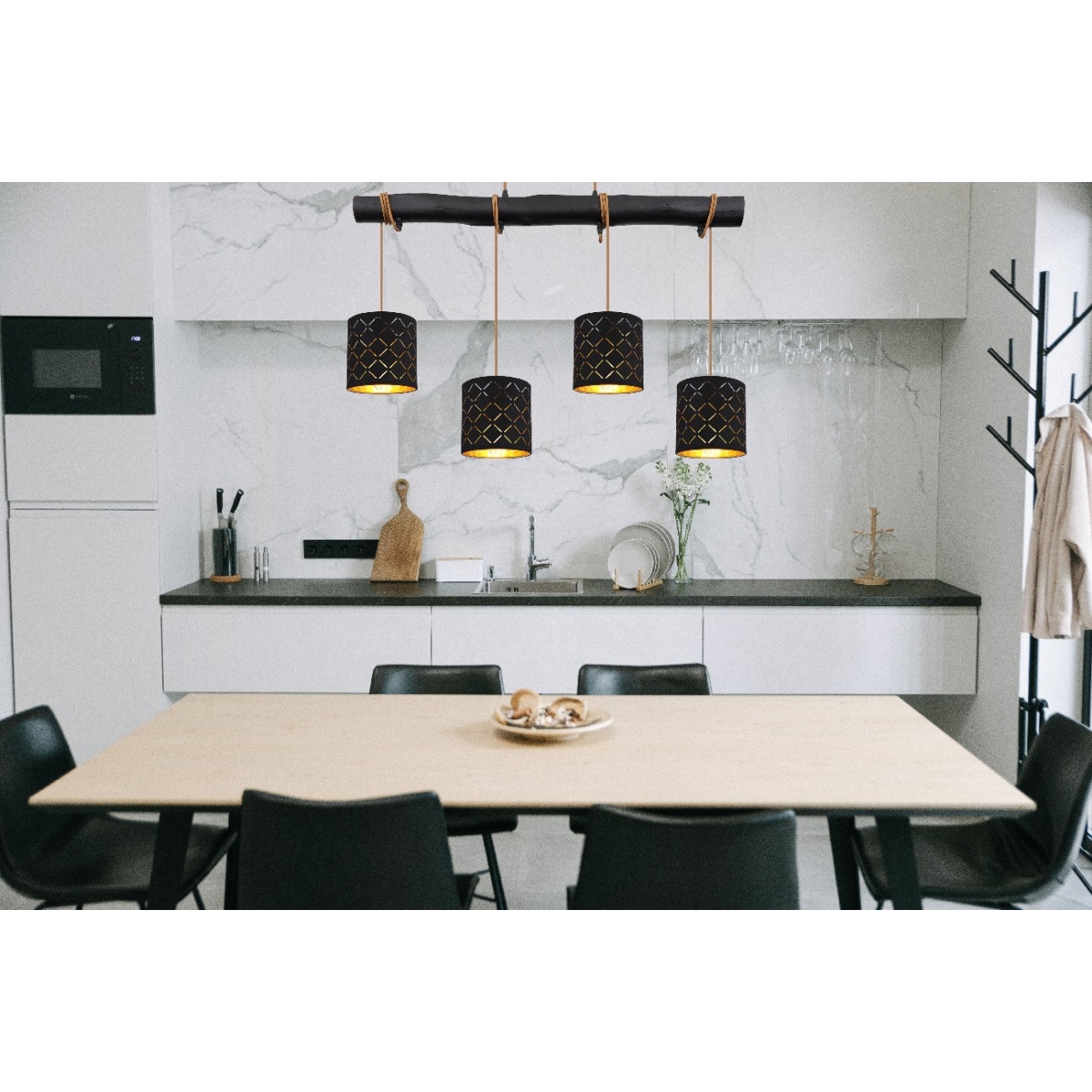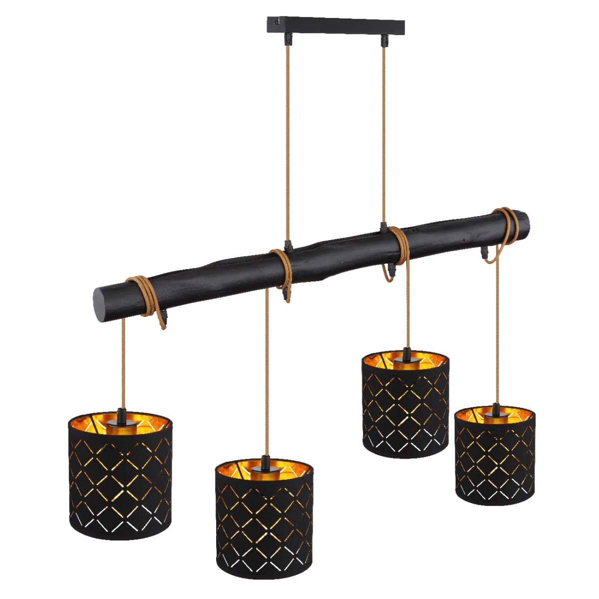 Ova visilica iz serije CLARKE ubeđuje svojim prelepim dizajnom crnog i zlatnog. Lampa se sastoji od 4 abažura sa ukrasnim detaljima, od kojih je svaki opremljen E27 grlom i visi sa plafona na kablovima zlatne boje. Visina lampe može se podesiti uz pomoć crnog drvenog stuba dužine 85 cm , ukupno 150 cm jednostavnim umotanjem. Grla E27 vam omogućavaju da koristite sijalice po vašem izboru, do maksimalne snage od 40 vati. Sa drugim modelima ove serije možete ulepšati svoj dnevni boravak.