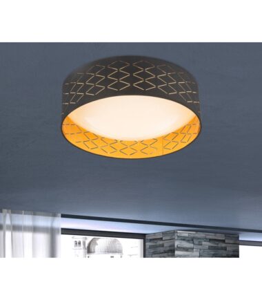 Ovo je moderna LED plafonska lampa. Svetli abažur ima ukrasne detalje, tako da se svetlo impresivno reflektuje. Crni tekstilni abažur ima prečnik od 40cm i visinu od 12cm. Lampa se savršeno uklapa u spavaću sobu, dozvolite sebi da budete impresionirani svetlosnim odrazima. Unutrašnji abažur je zlatne boje, što čini svetlost prijatno toplom. Zahvaljujući uključenoj LED sijalici od 18 vati, svetiljka obezbeđuje 1000 lumena jako svetlo sa udobnom toplom belom bojom od 3000K. Plafonska lampa odgovara mnogim modernim i savremenim stilovima života. Može se veoma dobro kombinovati sa drugim proizvodima iste serije.