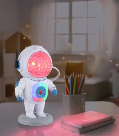 Stona lampa COSMO, sa svojim šarmantnim dizajnom astronauta, prava je atrakcija za svaku dečiju sobu ili kreativni radni prostor. Detaljno plastično kućište u beloj, sivoj i plavoj boji dopunjeno je providnim abažurom sa crvenim i srebrnim akcentima, unoseći futuristički izgled u svaki dom. Integrisana RGB LED lampa pruža raznovrstan spektar boja i može se podesiti na željenu boju pomoću dugmeta – idealno kao noćno svetlo ili za atmosfersko osvetljenje. Prekidač sa stepenastim podešavanjem omogućava jednostavno rukovanje. COSMO se napaja priloženim USB kablom ili USB kablom za punjenje (adapter nije uključen), što je čini svestranom za upotrebu – bilo na noćnom stočiću, stolu ili u pokretu. Sa ovom izvanrednom lampom, uronićete se u drugu galaksiju dok stvarate ugodnu i personalizovanu atmosferu osvetljenja. Savršena za male ljubitelje svemira i velike sanjare.