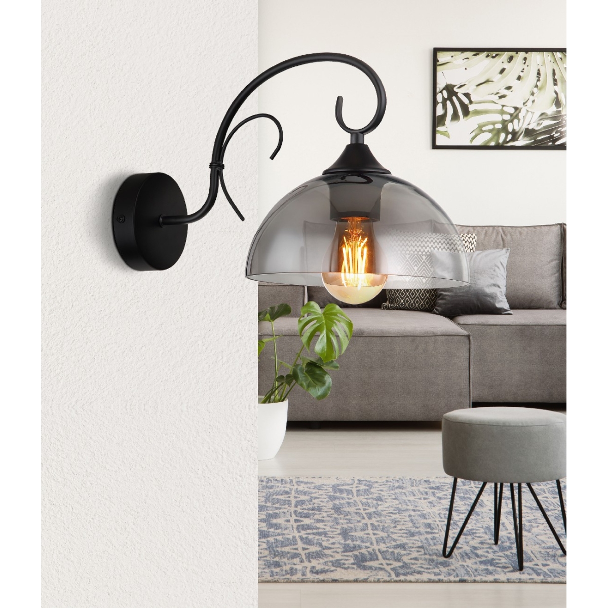Ova zidna lampa serije COTTAGE ima crnu mat metalnu bazu i staklo u boji dima. Svetlost lampe sija nadole. Dimenzije lampe su WxH: 200x220mm sa projekcijom od 340mm. Lampa zahteva E27 sijalicu sa maksimalnom snagom od 40W na naponu od 230V, ali ona nije uključena.