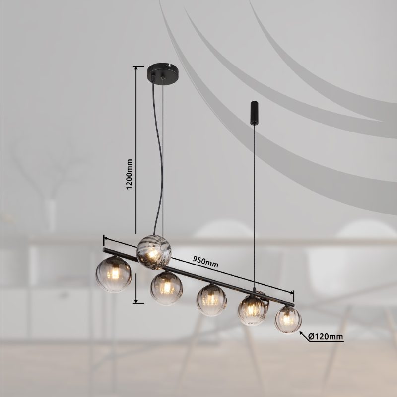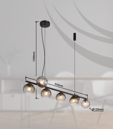 Visilica serije DALLERTA naparavljena je od crnog mat metala i providnog stakla boje dima. Sa dimenzijama od 950x280x1200 mm, privlačiće poglede u svakoj prostoji. Sijalice 7 x G9 LED nisu uključene u obim isporuke. Uz ostale proizvode iz ove serije možete da upotpunite sliku u vašem prostoru.