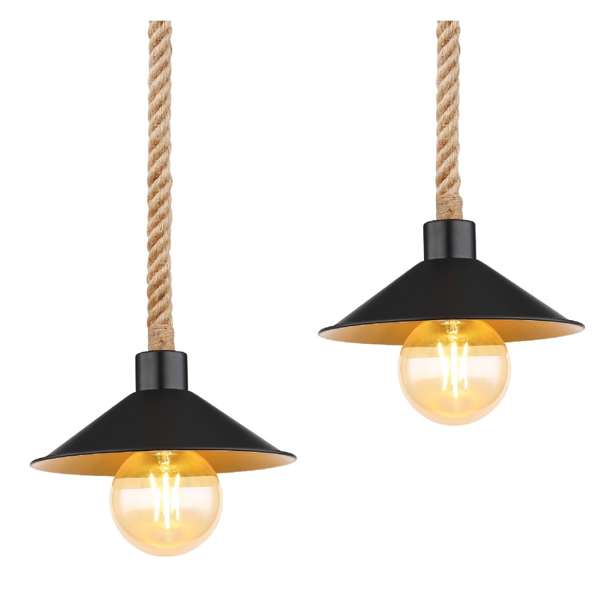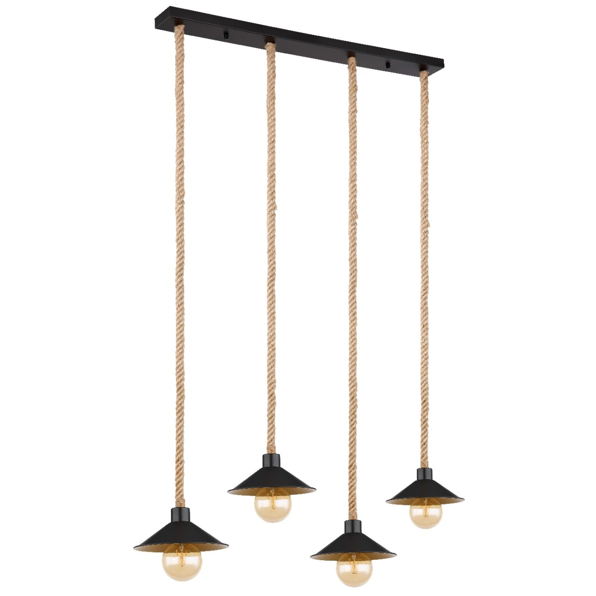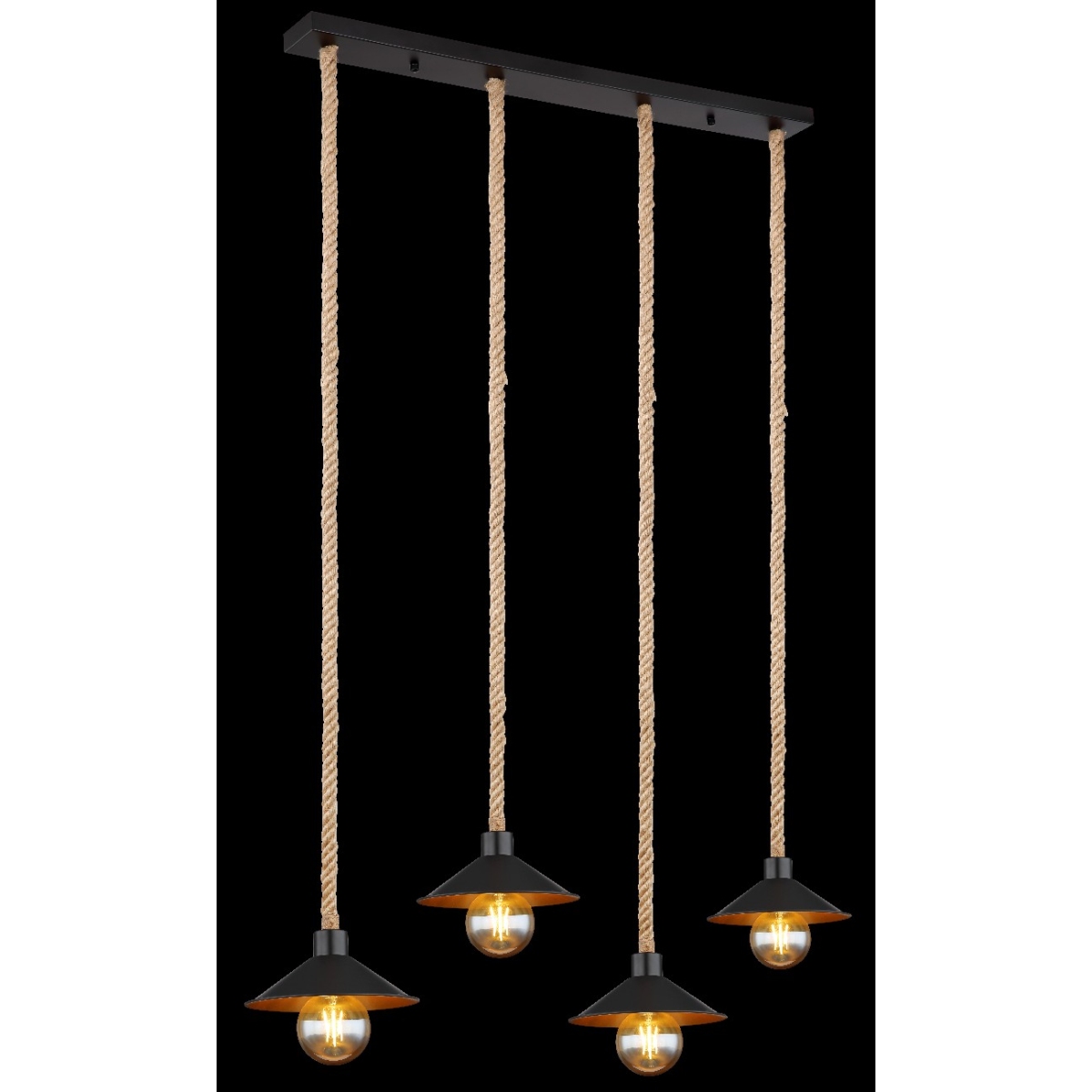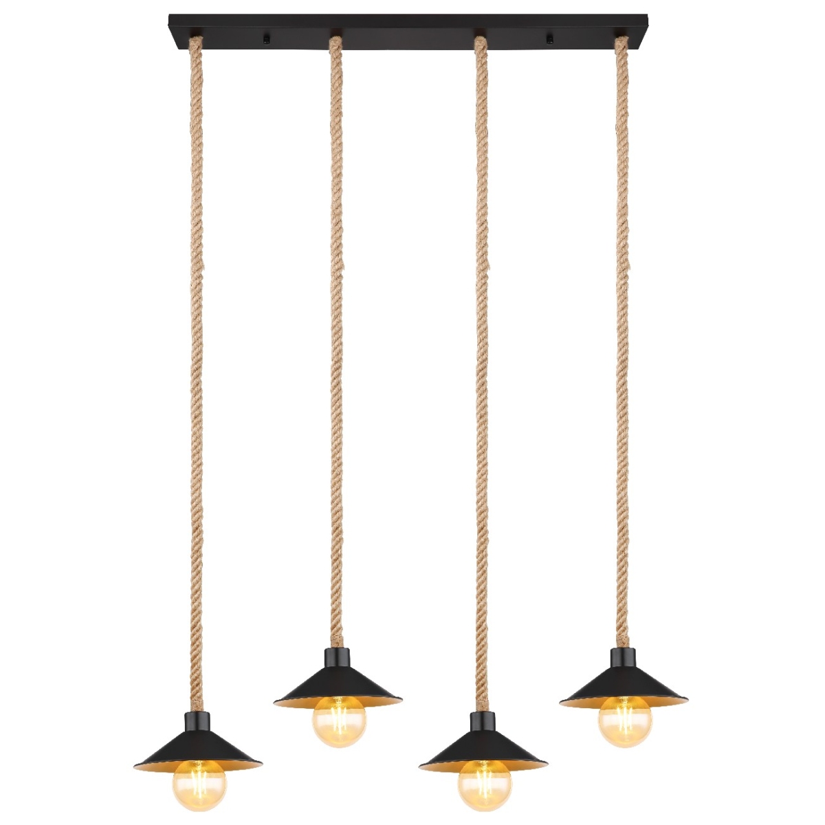 Ova visilica ubeđuje svojim prelepim dizajnom crne i zlatne boje. Lampa se sastoji od 4 abažura (Ø22cm) koja su zlatne boje iznutra i crne spolja, svaka je opremljena E27 grlom i visi 1,7 metara od plafona na prelepim upletenim konopljastim konopcima. Pomoću E27 grla možete sami da odredite boju svetla i jačinu, do maksimalne snage od 60 vati.