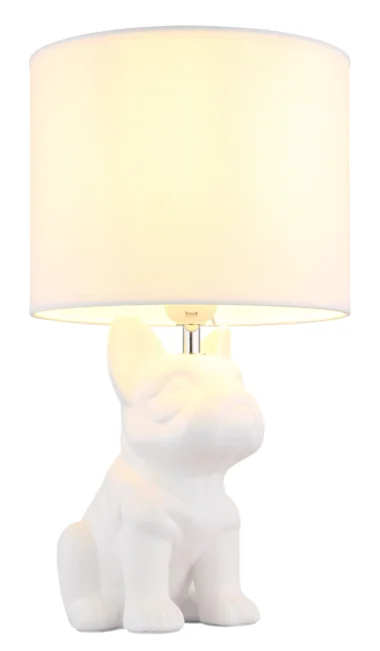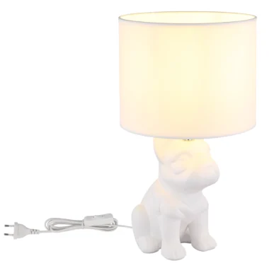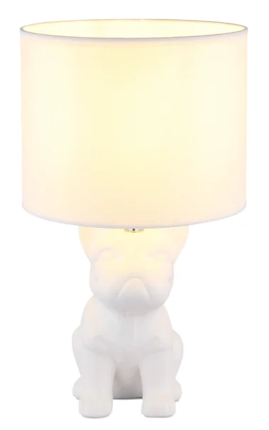 Stona lampa DOGO kombinuje životinjski šarm sa stilskom elegancijom. Centralna tačka je telo, oblikovano kao sedeći francuski buldog, napravljeno od mat bele keramike, koje je s ljubavlju dizajnirano i služi kao atrakcija u svakoj prostoriji. Okrugli abažur od tkanine u usklađenoj beloj boji stvara meku, prijatnu atmosferu osvetljenja i harmonično se uklapa sa širokim spektrom stilova uređenja enterijera. Bilo da je u pitanju noćna lampa u spavaćoj sobi, dekorativni element u dnevnoj sobi ili prijatan akcenat osvetljenja u hodniku – DOGO stvara ugodnu atmosferu svuda. Lampa se lako koristi pomoću prekidača na kablu. Stona lampa je kompatibilna sa sijalicom E27 (nije uključena), što vam omogućava da individualno podesite boju svetlosti i osvetljenost. Sa DOGO, ne samo da unosite funkcionalno osvetljenje u svoj dom, već i šarmantan kućni dodatak.