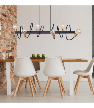 Visilica EDDY poentira svojim starinskim i istovremeno jednostavnim dizajnom. Kombinacija crnog i zlatnog metala daje ovoj lampi tipičan starinski stil. Na dva viseća, crna tekstilna kabla nalazi se šina, sa koje se može pojedinačno podesiti šest flekso grana koje se nalaze na njoj. Grla E27 omogućavaju slobodan izbor sijalica do 60 vati. Uz ostale modele ove serije možete dodatno ulepšati životni prostor.