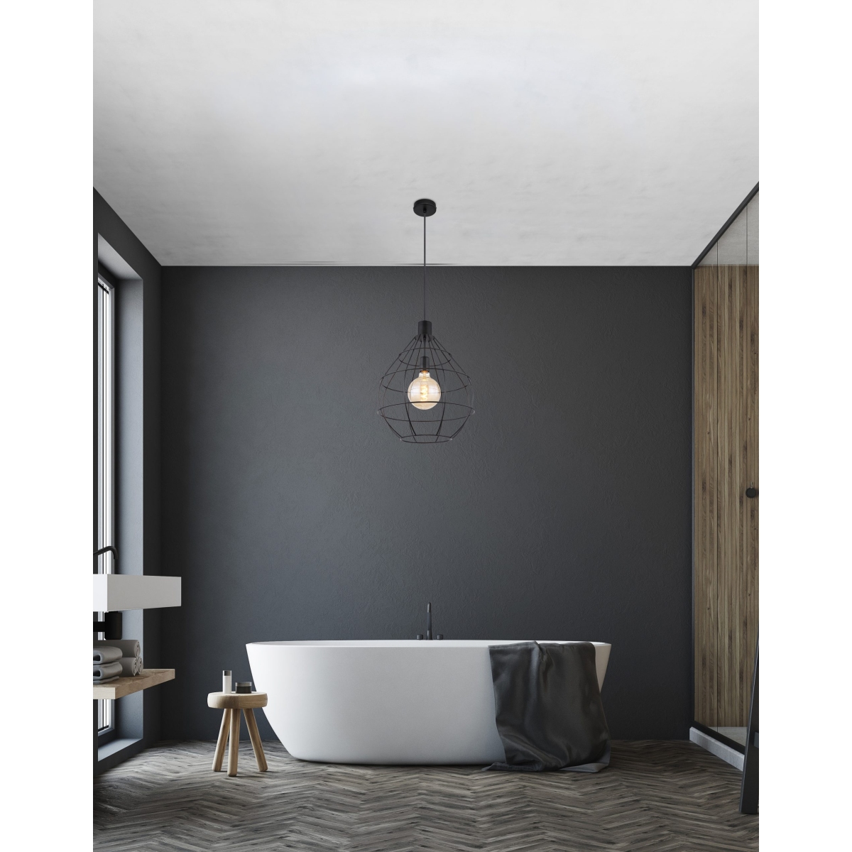 EDWIN visilica (Ø 37cm) ističe se svojim retro stilom. Dugačka 120 centimetara, ima okrugli abažur, koji kroz crne metalne grane dočarava izuzetan doživljaj u svakoj prostoriji. Zbog slobodnog izbora izvora svetlosti (E27/max. 60W), možete sami odrediti intenzitet svetlosti i laganu boju ove unutrašnje lampe. Zbog njihove dugovečnosti preporučujemo vam korišćenje LED sijalica.