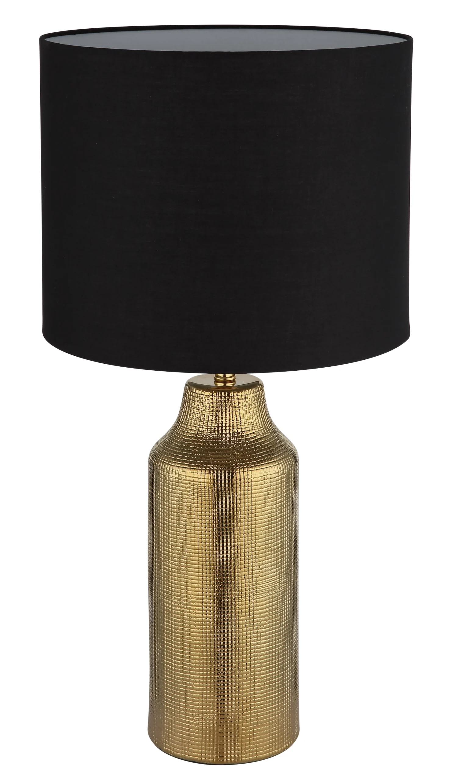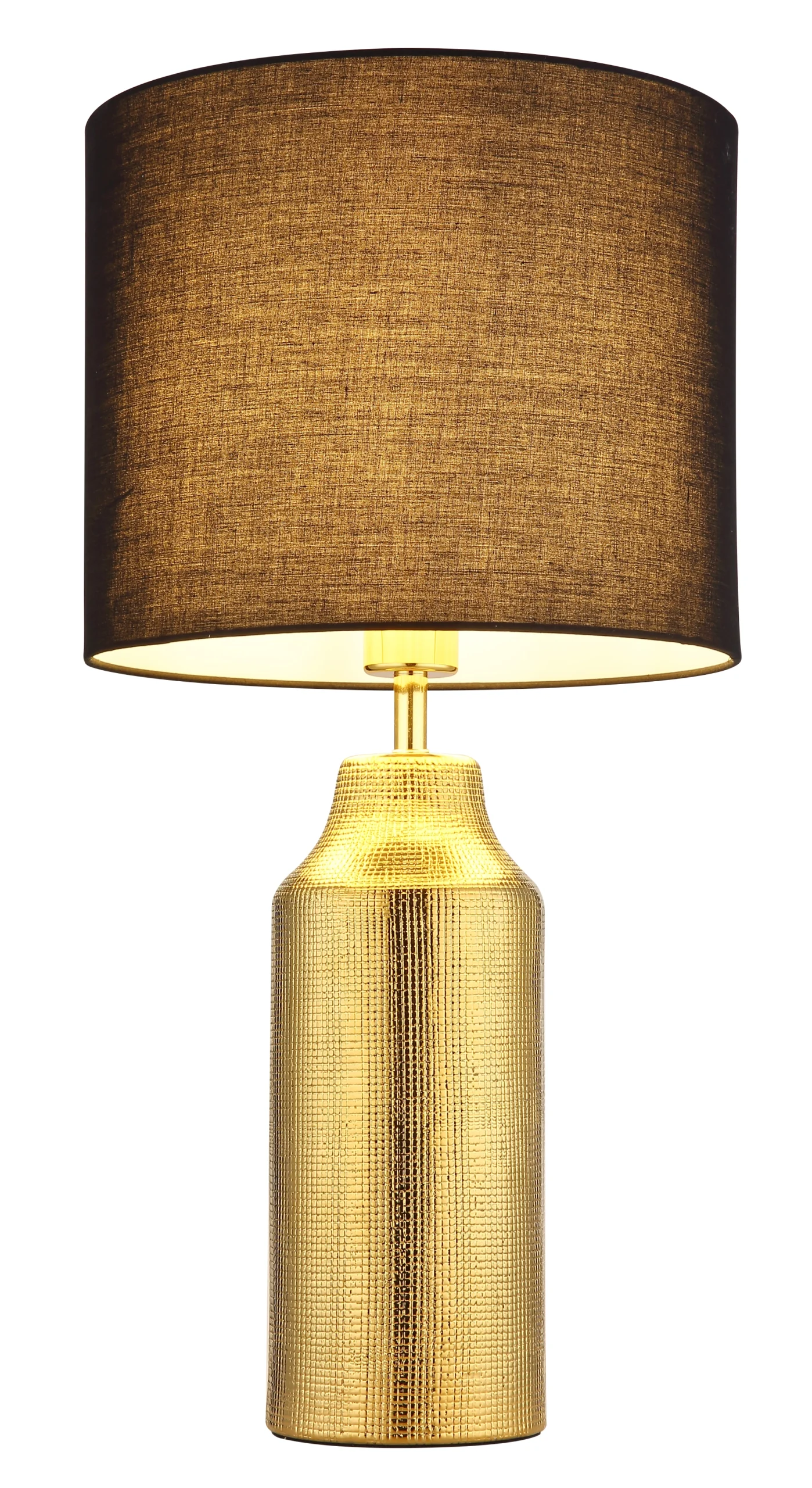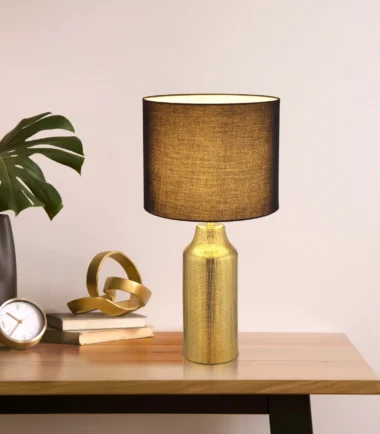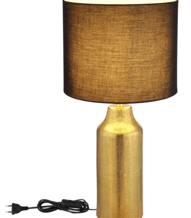 Stona lampa ELDEN dodaje dašak luksuza i elegancije svakoj prostoriji. Sa svojim keramičkim postoljem zlatne boje i cilindričnim, crnim platnenim abažurom, postavlja stilske akcente i lako se prilagođava različitim stilovima nameštaja. Veliki prečnik od Ø:305 mm obezbeđuje prijatnu raspodelu svetlosti i stvara toplu, privlačnu atmosferu. Praktični prekidač na kablu omogućava lako rukovanje, dok grlo E27 nudi fleksibilnost u izboru izvora svetlosti. Idealna za dnevnu sobu, spavaću sobu ili kao osvetljenje za sto, stona lampa ELDEN kombinuje funkcionalno osvetljenje sa elegantnim dizajnom. Njihov klasičan oblik i plemeniti materijali čine ih pravim atrakcijom u vašem domu.