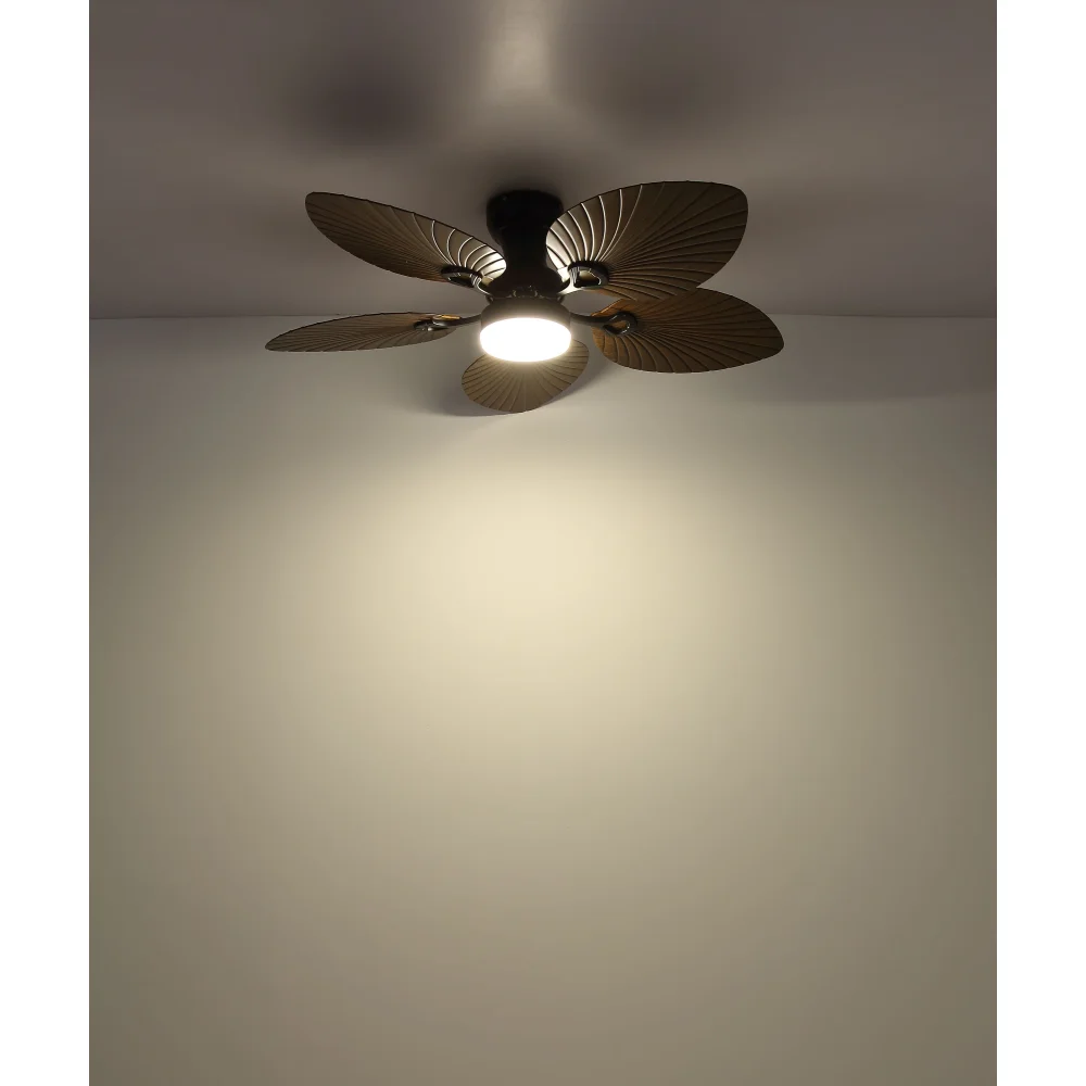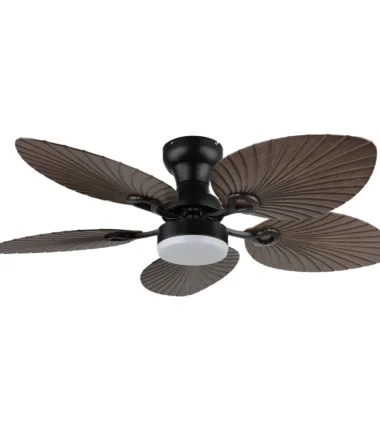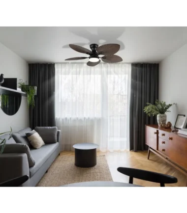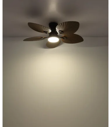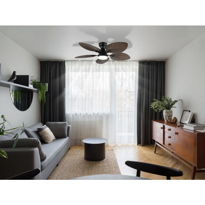 Okrugli plafonski ventilator ELISE impresionira svojim neobičnim izgledom i dobro osmišljenom funkcionalnošću. Pet lopatica u stilizovanom obliku lista napravljene su od tamne plastike sa izgledom drveta i daju ventilatoru prirodan, elegantan izgled. Telo od crnog, mat metala i aluminijuma upotpunjuje dizajn modernom jasnoćom. Abažur od crnog metala sa opal belom plastikom obezbeđuje prijatnu, ravnomernu raspodelu svetlosti. Sa svetlosnim izlazom od 1897 lumena i CCT funkcijom od 3000 K do 6000 K, ELISE nudi individualno podesivo svetlo – od tople do hladne. Boje se mogu fiksirati i zahvaljujući funkciji memorije vaša željena podešavanja se čuvaju. Priloženi daljinski upravljač vam omogućava da lako kontrolišete svetlo i ventilator. ELISE kombinuje stilski dizajn, efikasnu ventilaciju i modernu LED tehnologiju – idealno za životne prostore sa karakterom.