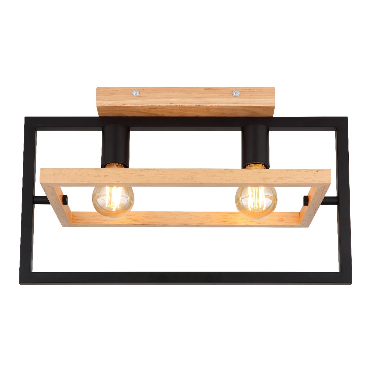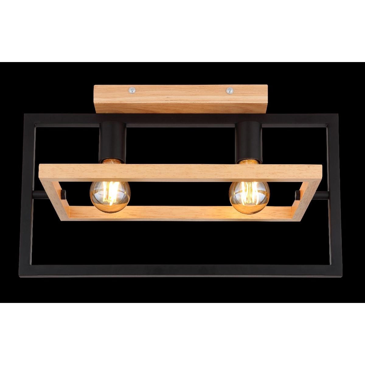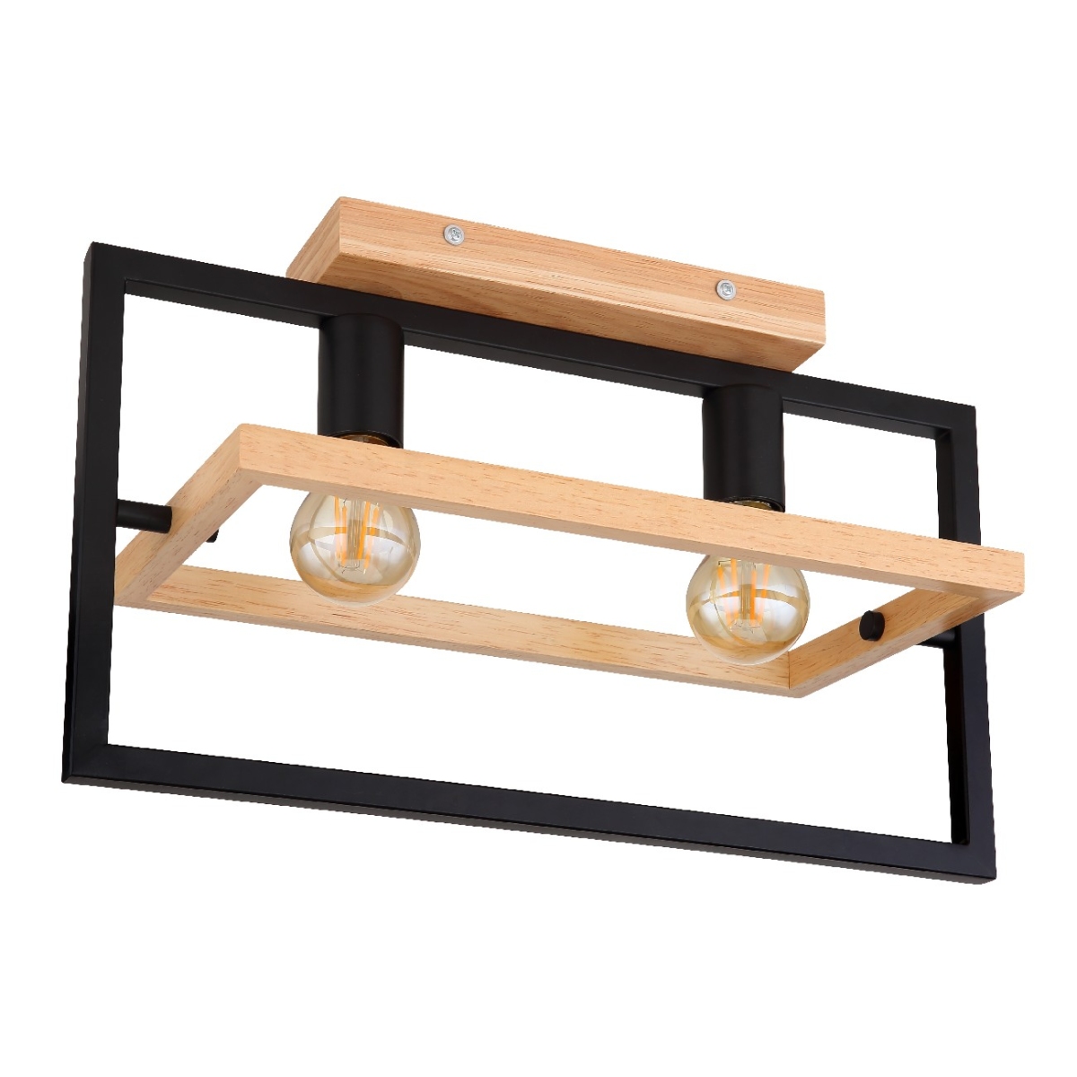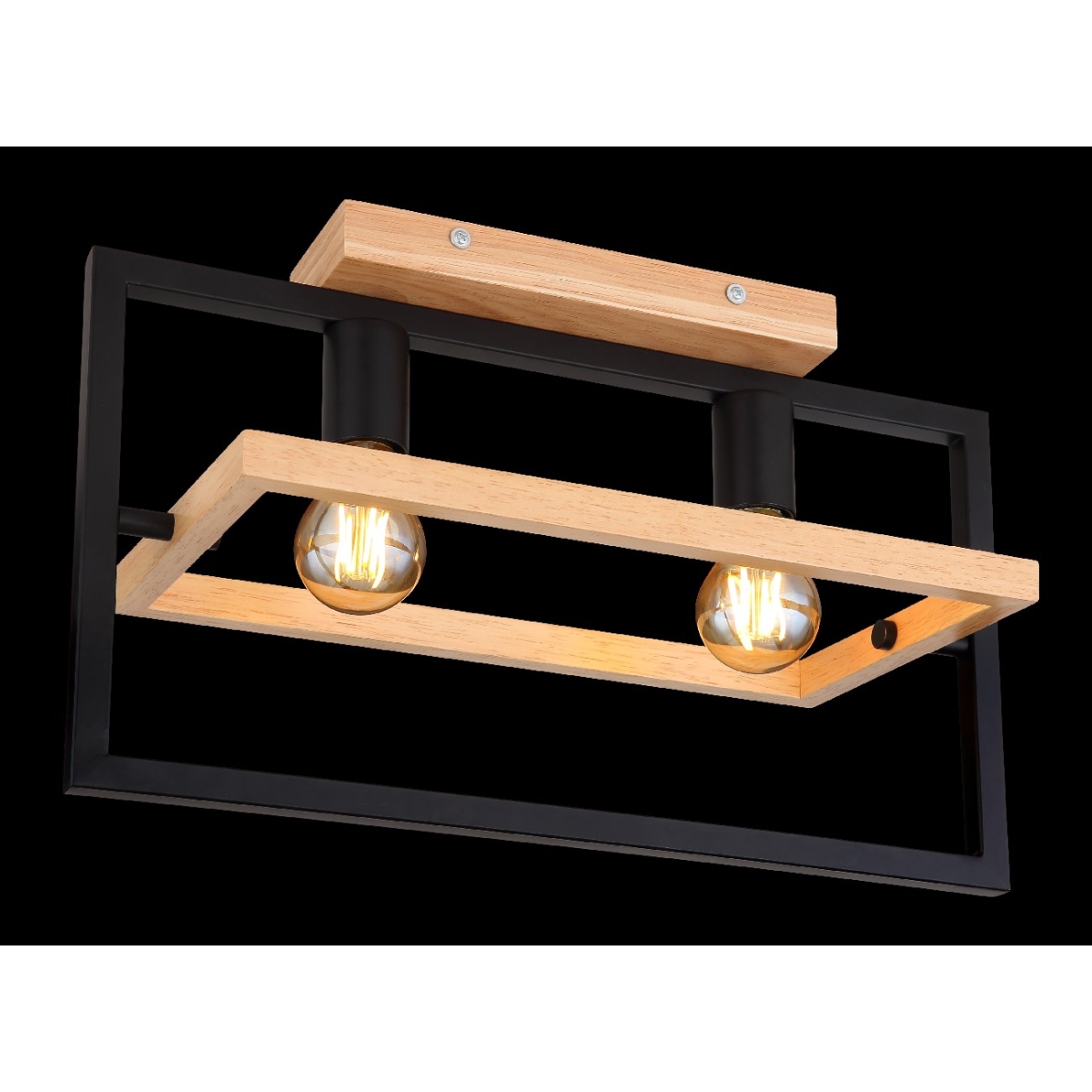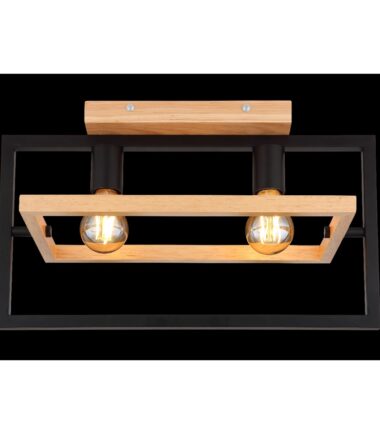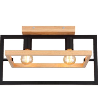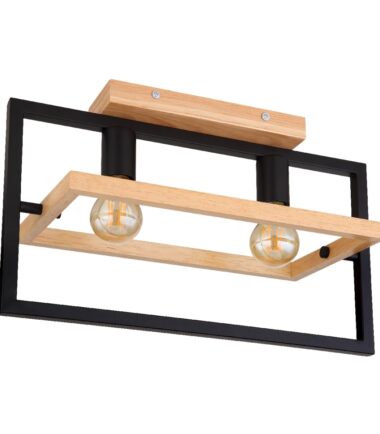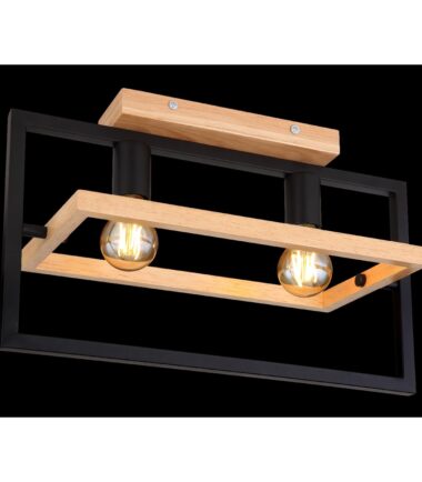 Ova izuzetno moderna plafonska lampa impresionira svojim sjajnim dizajnom. Ona se sastoji od crnog mat pravougaonog metalnog okvira dužine 46cm na kojem se nalaze dva grla E27 i okružen je drugim pokretnim pravougaonikom napravljenim od drveta širine 21cm. Grla E27 vam omogućavaju da slobodno odaberete sijalicu do maksimalne snage od 60 vati.