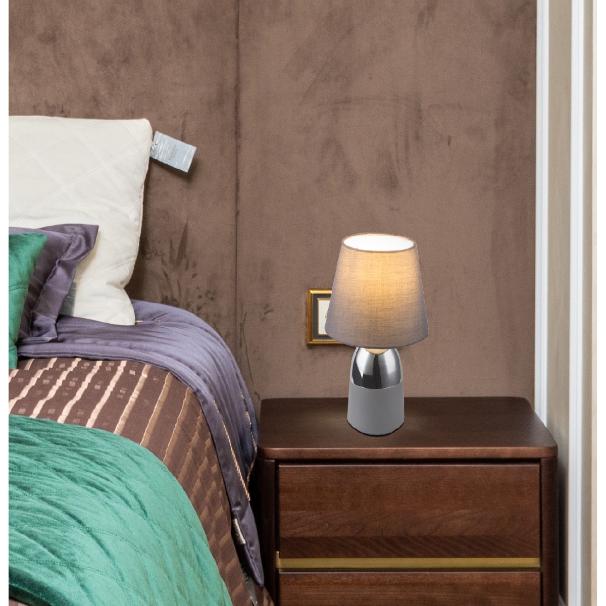 Ovo je prelepa, moderna 31cm visoka stona lampa iz EUGEN serije. Abažur je napravljen od sivog tekstila i ima prečnik od 16cm. Tekstilni abažur malo prigušuje svetlo, što ga čini prijatnijim. Vrhunac lampe je verovatno ova plemenita svetlosna baza napravljena od hroma. Svetlosna baza je veoma moderna, pa se lampa može integrisati u mnoge savremene stilove življenja. Stona lampa je idealna kao lampa pored kreveta. Pored toga, lampa ima prekidač za dodir, tako da lako možete da uključite i isključite lampu. Zahvaljujući E14 grlu, imate mogućnost da odredite osvetljenje, kao i boju svetla i intenzitet svetlosti. Preporučujemo LED sijalice zbog njihove trajnosti i uštede energije.