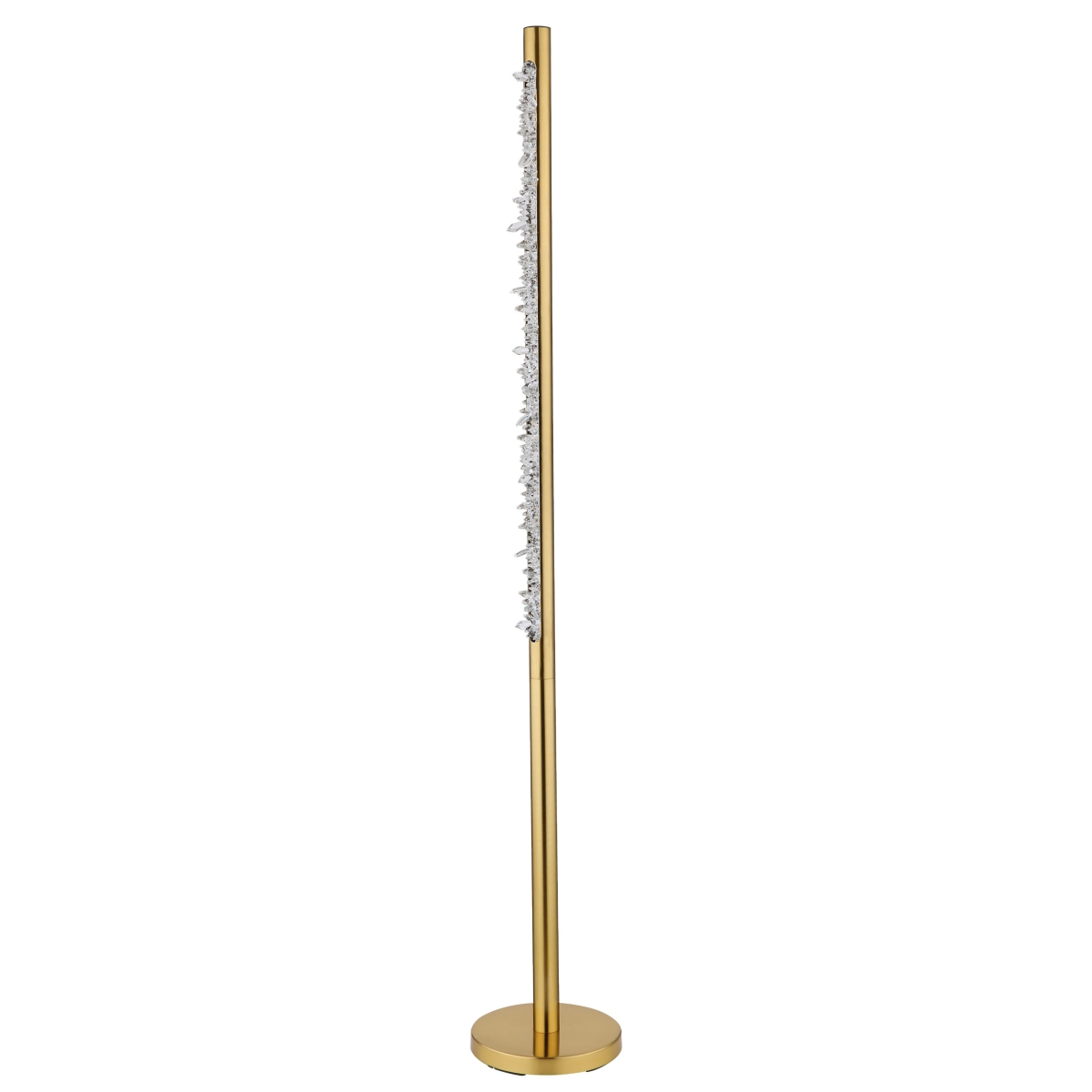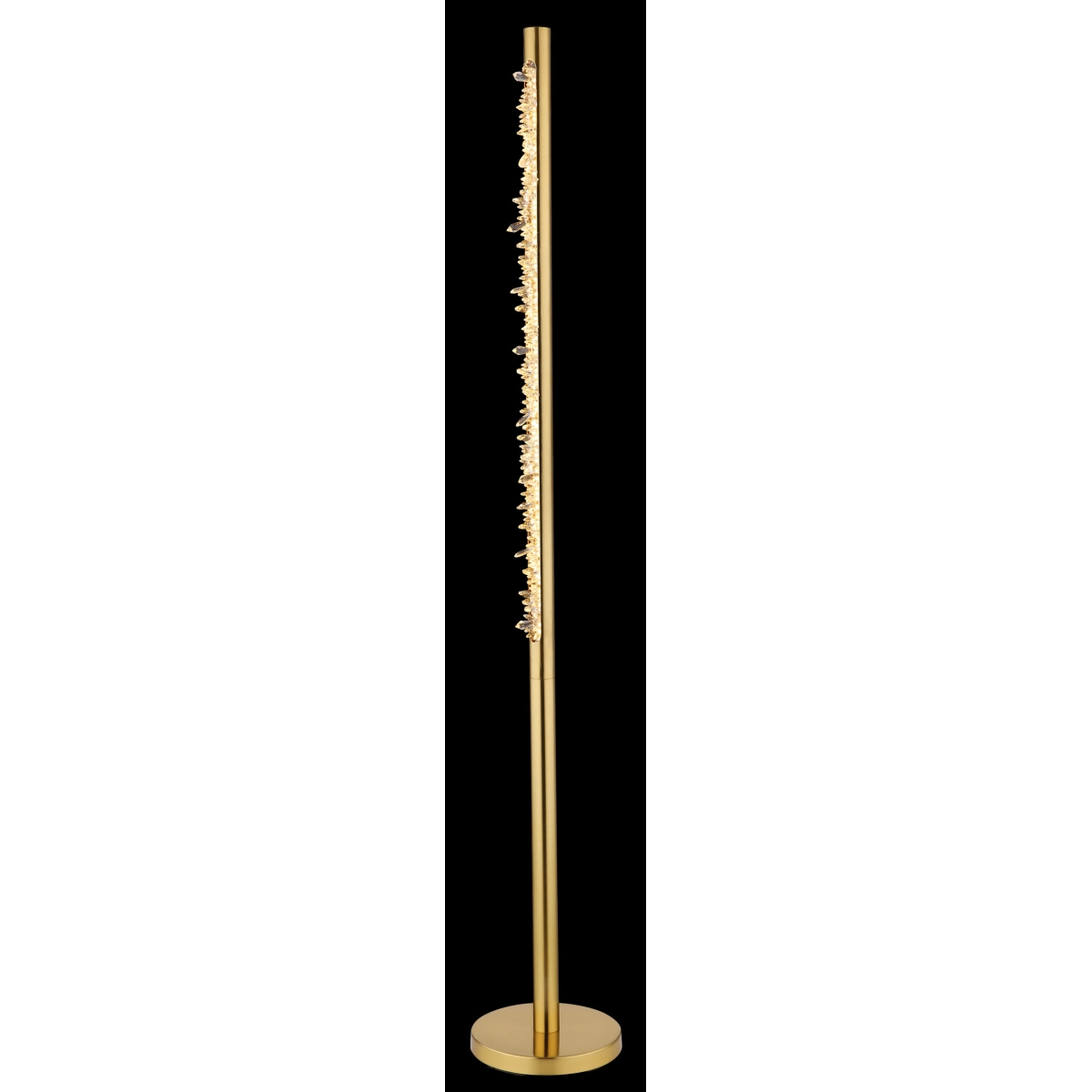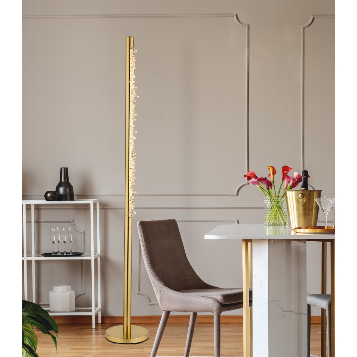 Ova podna lampa iz serije FELICITAS (ø 23 cm) impresionira svojim jednostavnim dizajnom napravljenim od metala mesingane boje. Podna lampa dužine 151 cm sastoji se od metalne grane fiksirane za okruglu podlogu i ima prelepe akrilne kristale sa jedne strane. Ovi prekrivaju uključene LED sijalice, koje obezbeđuju 980 lumena jako svetlo prijatnom svetlom bojom od 3000 Kelvina (topla bela). Sa drugim modelima iste serije možete upotpuniti celokupnu sliku u enterijeru.